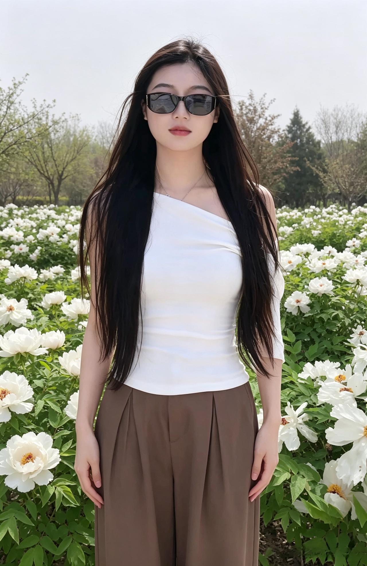深棕的长裤垂落,与身后的花海形成温柔的对比。