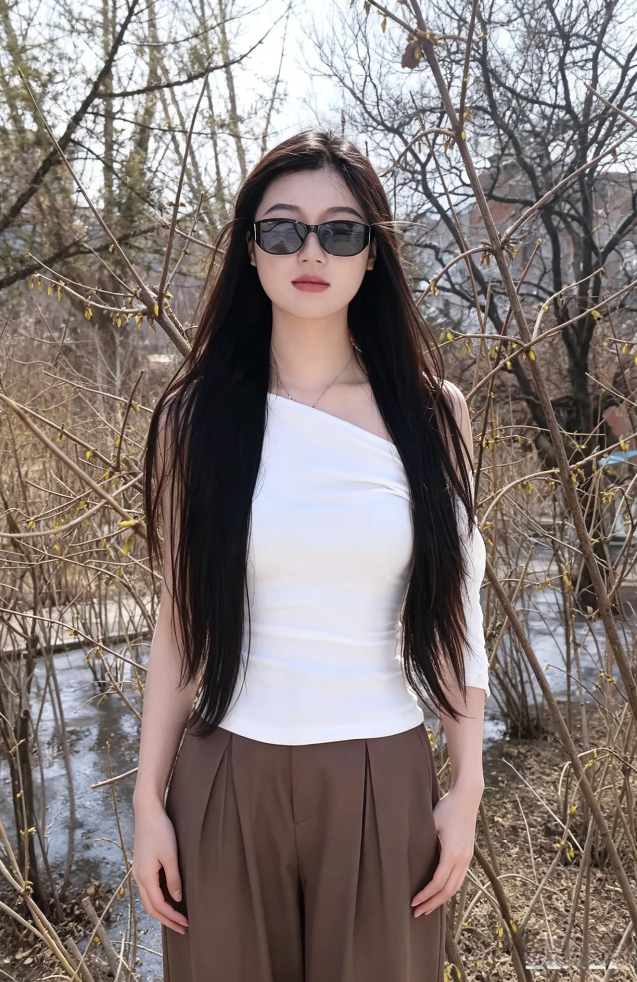 白色的斜肩上衣,裁出肩颈流畅的弧度,是春日里干净的线条。