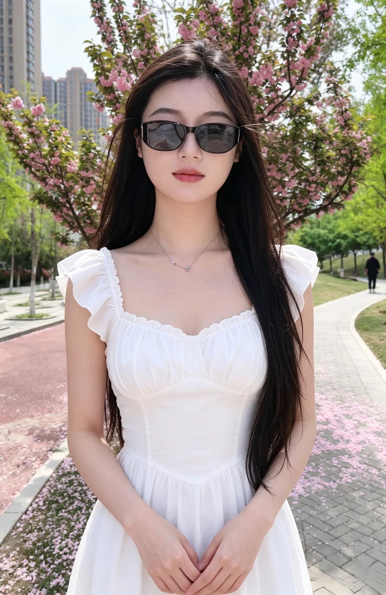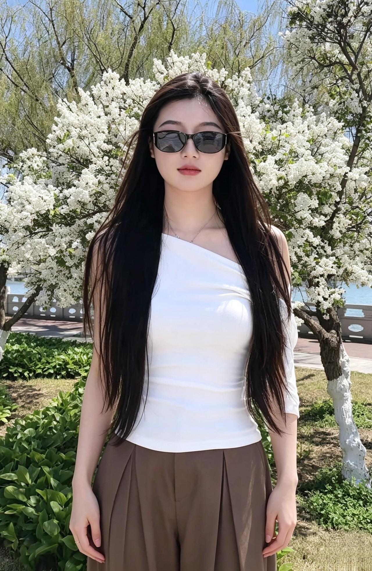 繁花在身后盛开,白色的花瓣叠成浪,漫过你的肩头。 你站在绿意与花香之间,像一首冷