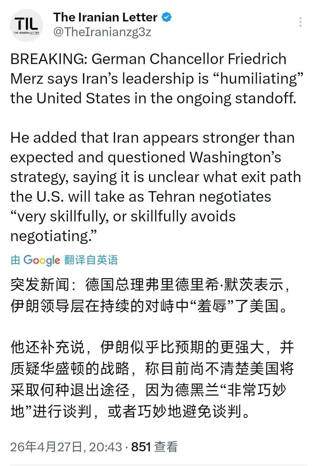 4月28日,德国《明镜周刊》报道:“总理默茨表示,伊朗在持续的对峙中‘羞辱’了美国,伊朗似乎比预期的更强大,并质疑华盛顿的战略,称目前尚不清楚美国将采取何种退出途径,因为德黑兰‘非常巧妙地’进行谈判,或者巧妙地避免谈判。”
