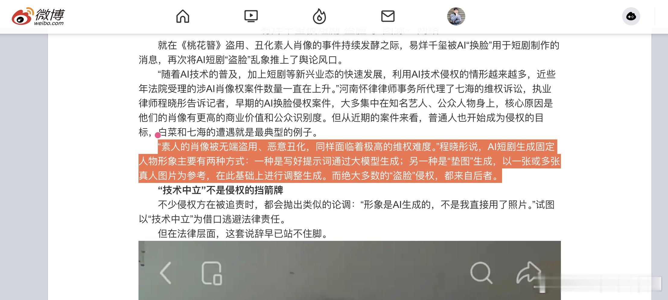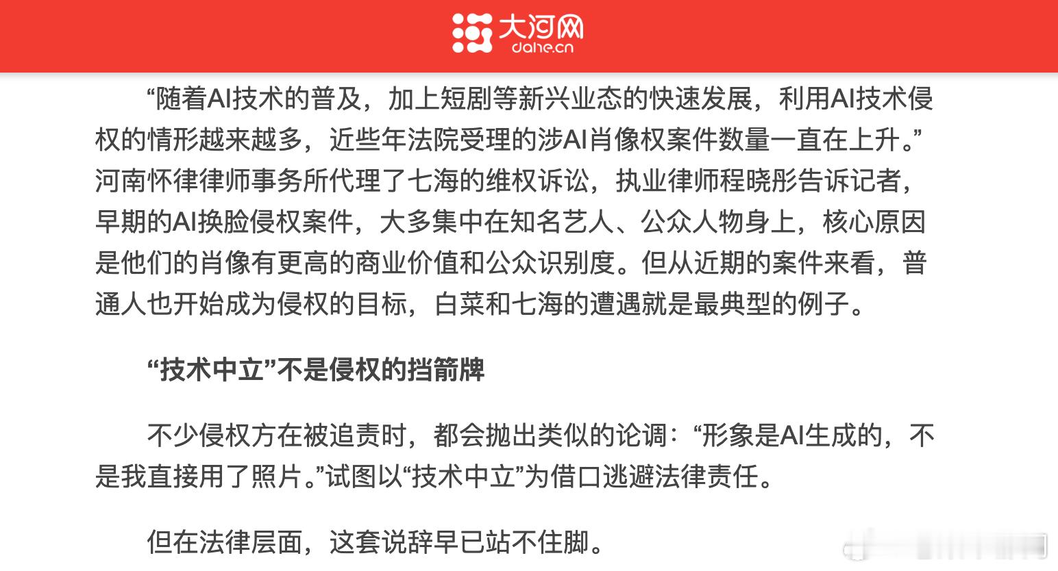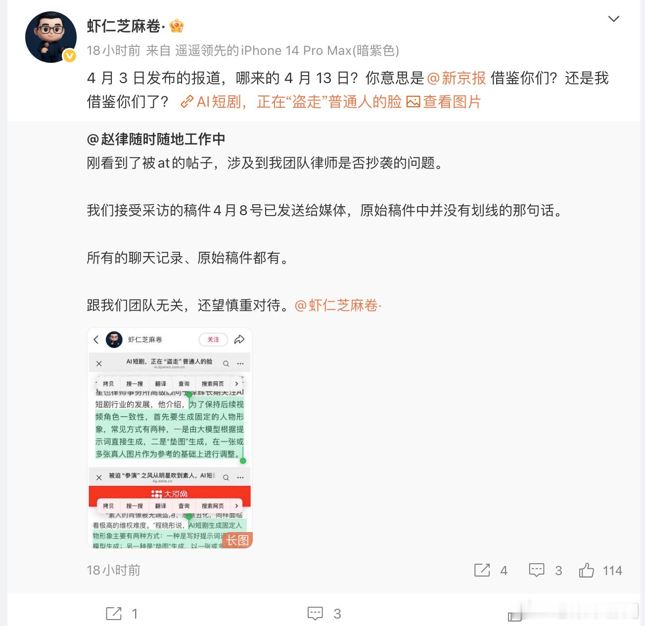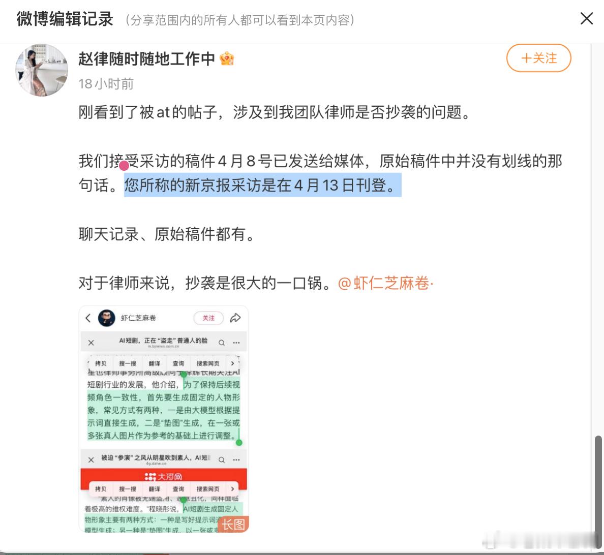 刷到一个很有趣的事情,一位律师发帖质疑另一位律师 在接受的采访时,蒸馏了自己接受采访时的表达,并且出现了不理解原文意思的生搬硬套,但是 回应说自己接受采访没有回答这个问题,甚至采访提纲里也没有这个问题(图1)。而她的同事 回应说她们接受采访的稿件4月8号已发送给媒体,原始稿件中并没有被指抄袭那句话,还说新京报的采访是在4月13日刊登。但是这也遭到了 的质疑,他转发并附上的链接,实际上是他受访报道刊发于4月3日,也就是在 说的“已发送给媒体”之前,这样他质疑“你意思是借鉴你们?还是我借鉴你们了?”。(图2)后续 又把“新京报采访是在4月13日刊登”给编辑掉了,现在在编辑记录里还能查到。(图3)这件事真正有趣的部分是,如果现在打开一开始贴出的的链接(被迫“参演”之风从明星吹到素人,AI短剧的数字“脸面”该咋守?丨“法式”生活)(图4),会发现涉及争议的段落已经不见了,而在相关的一些博文和转载中还是可以看到的,比如说被迫“参演”之风从明星吹到素人,AI短剧的数字“脸面”该咋守? (图5)。结合两位律师都发布的截图和目前的信息,显然是大河网在自己的官网做了删改,但是目前没有媒体方面的说法,究竟是律师抄袭被戳破,还是媒体张冠李戴搞出来的乌龙呢?其实这就需要媒体方面给一个说法了。如果我们认为没有人故意说谎,那么我做一个不负责任的猜测,从我在媒体工作的经验看,有时候记者会在采访得到回复之前,把一些网上的资料备在文章里,这样如果被采访对象没有回复,那么就可以直接用这段,而如果采访对象回复了,再把这段替掉,但是有时候记者会改乱了,没有把之前的备稿清理干净,结果后续删改的时候就把这两部分接上搞混了,于是出现张冠李戴。那么是不是这样呢?我也不知道,还是那句话:需要媒体方面给一个说法了。