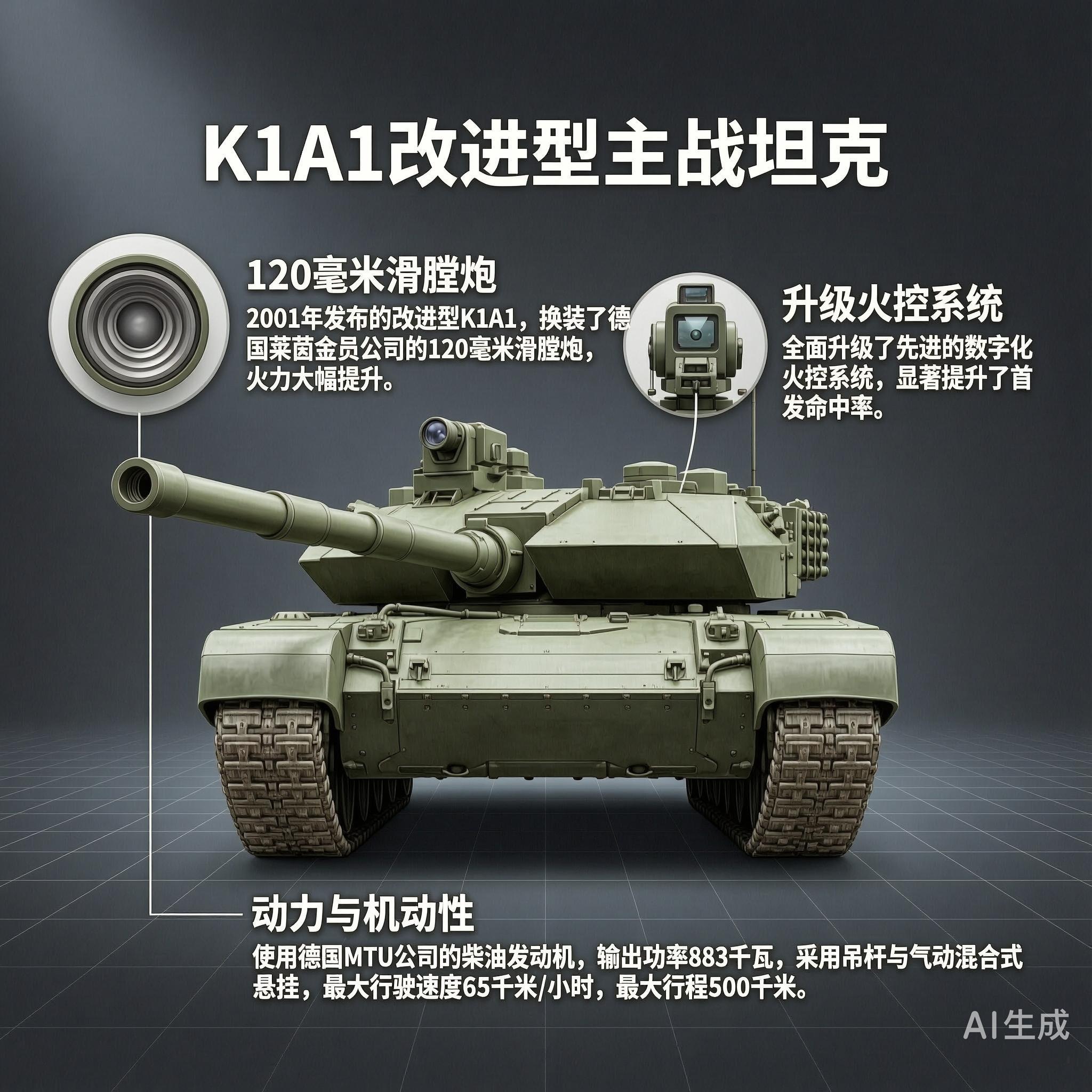 K1坦克使用105毫米主炮,外形酷似美军M1主战坦克。但2001年发布的改进型K1A1则使用了德国莱茵金属公司的120毫米滑膛炮,而且升级了火控系统。该坦克的辅助武器为包括2挺7.62毫米同轴机枪和1挺12.7毫米防空机枪,并在炮塔前部的两侧各装有一组六联装烟幕弹发射器。K1坦克采用复合装甲,具备一定的动能弹和化学弹防护能力。其外形尺寸也尽量紧凑,以降低中弹率。K1坦克使用德国MTU公司的柴油发动机,输出功率为883千瓦,采用吊杆与气动混合式悬挂,最大行驶速度为65千米/小时,最大行程500千米。
