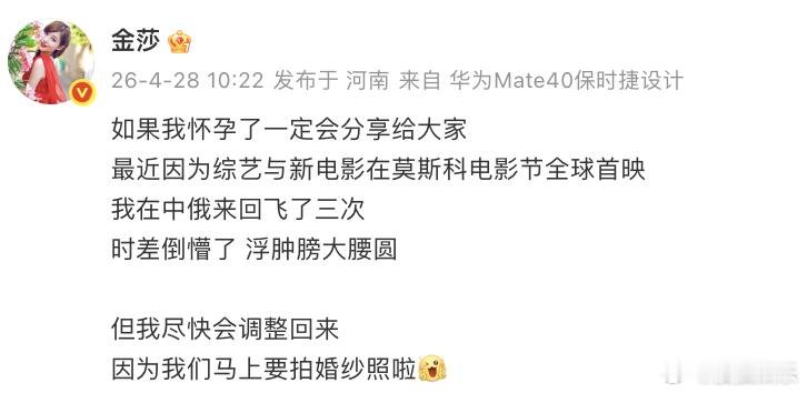 金莎否认怀孕近日,金莎在出席活动时被指有孕相,引发怀孕猜测。刚刚,金莎发文否认怀孕,解释自己是因为海内外往返倒时差造成的浮肿,夫妻二人最近在准备拍婚纱照,如果怀孕了一定会分享给大家