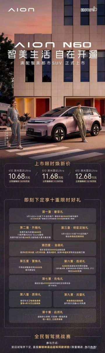 年轻人的第一台智能满配好车10.68万起埃安N60正式上市,售价10.68万起,主打15万内高价值国民SUV。该车实现百余项配置全系标配,搭载高阶智驾系统与激光雷达等硬件,智驾能力出色。同时拥有高得房率空间、零重力副驾座椅与五连杆悬架,兼顾舒适与操控。新车无额外选装加价,性价比突出,预售半月订单破八千,超七成订车用户为年轻首购群体。11万拿下30万级高阶辅助驾驶埃安N60