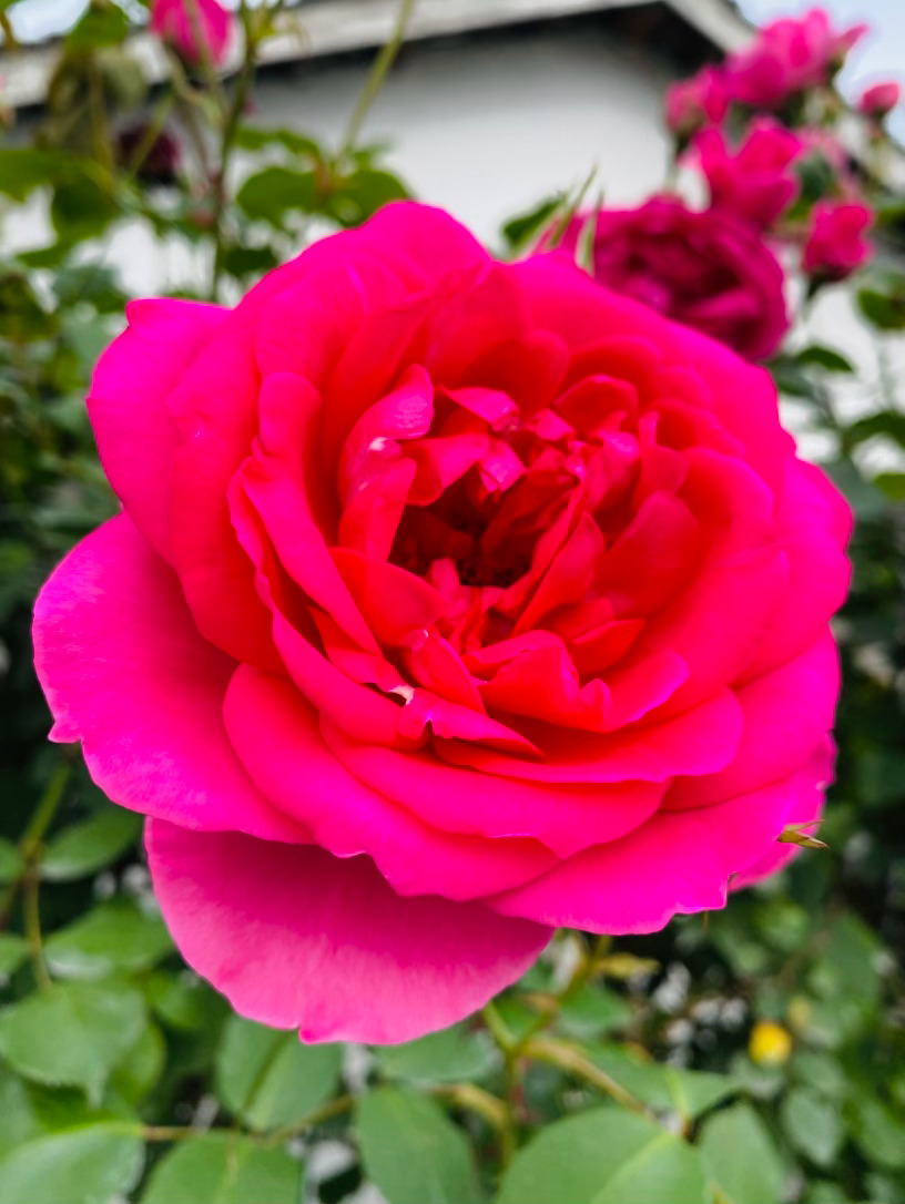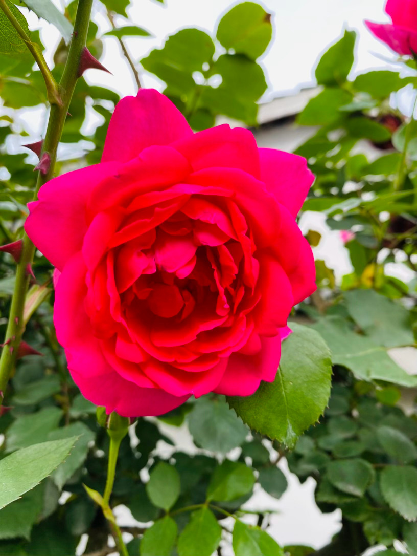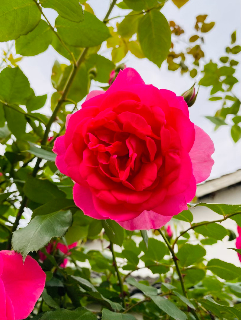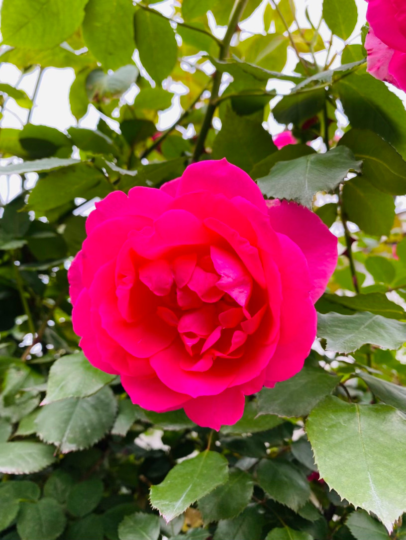 上百片花瓣层层叠叠,交织出令人窒息的古典杯型,宛如精致的红丝绒,流转着绸缎般馥郁的光泽。那浓郁到极致的玫红,是它在阳光下无声的呐喊,外瓣微泛的粉调,又为这份霸气添了一抹温柔的底色。
