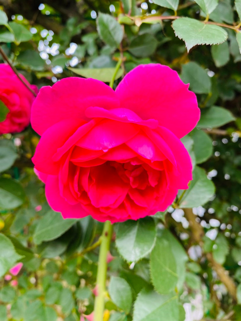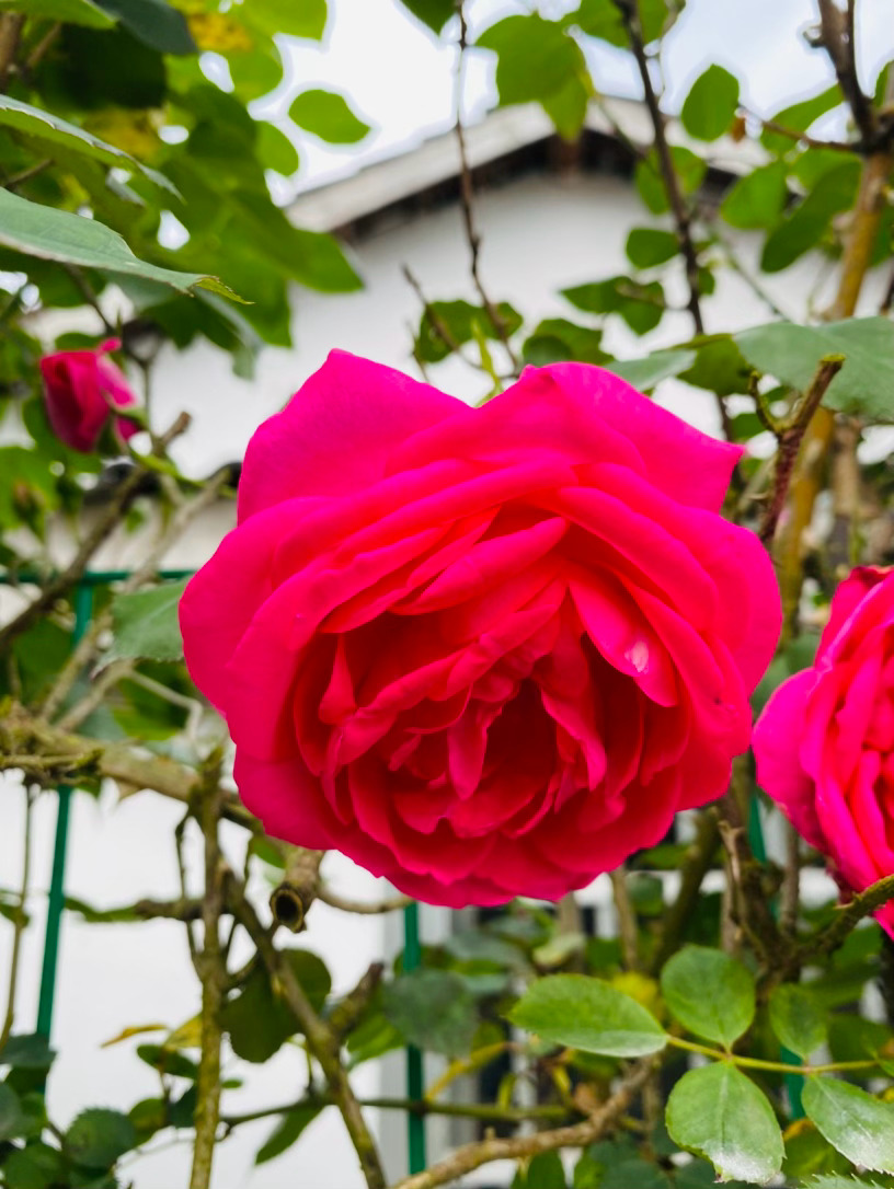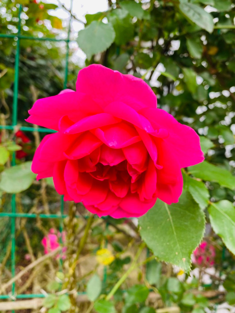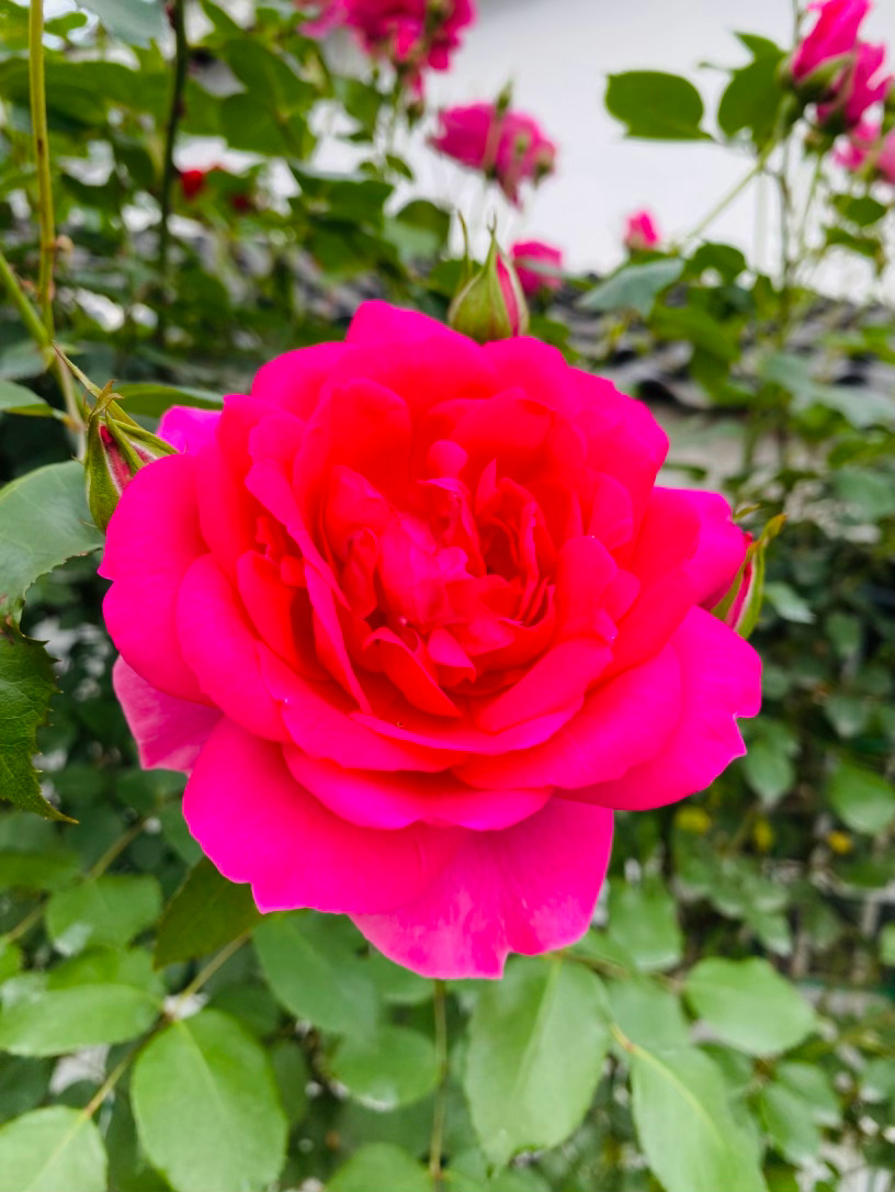 上百片花瓣层层叠叠,交织出令人窒息的古典杯型,宛如精致的红丝绒,流转着绸缎般馥郁的光泽。那浓郁到极致的玫红,是它在阳光下无声的呐喊,外瓣微泛的粉调,又为这份霸气添了一抹温柔的底色。