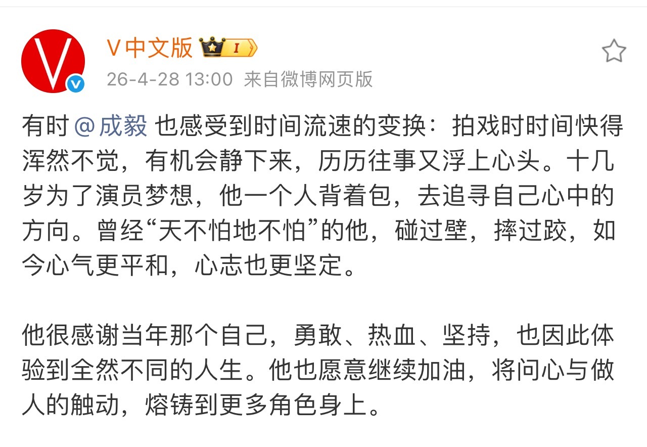 成毅说感谢曾经的自己,勇敢热血坚持!成毅粉丝很想说,感谢一直“天不怕地不怕”追随