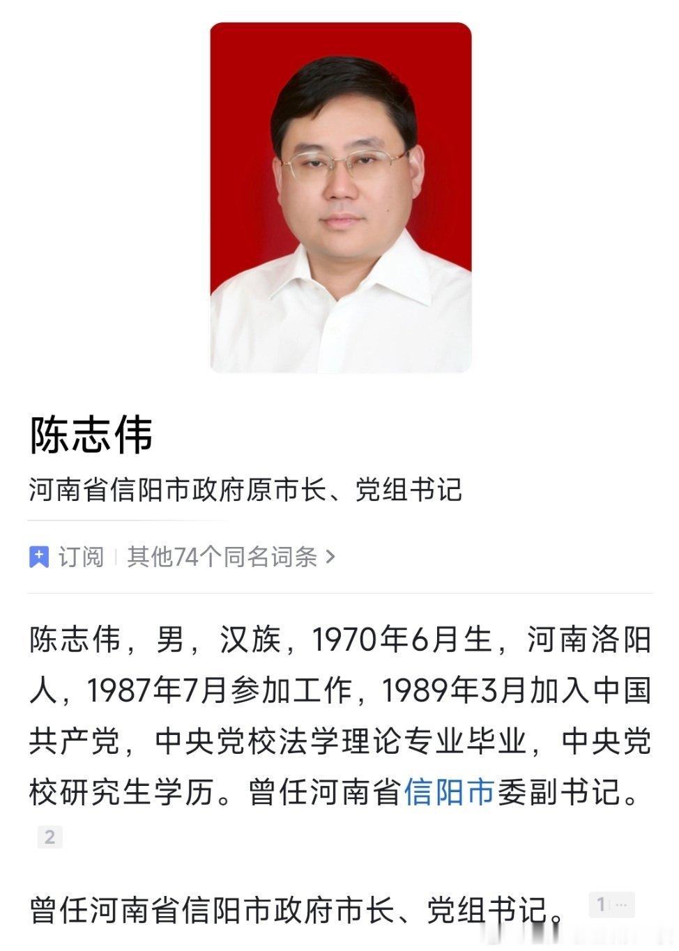 陈志伟任河南投资集团董事长,此前为信阳市长。