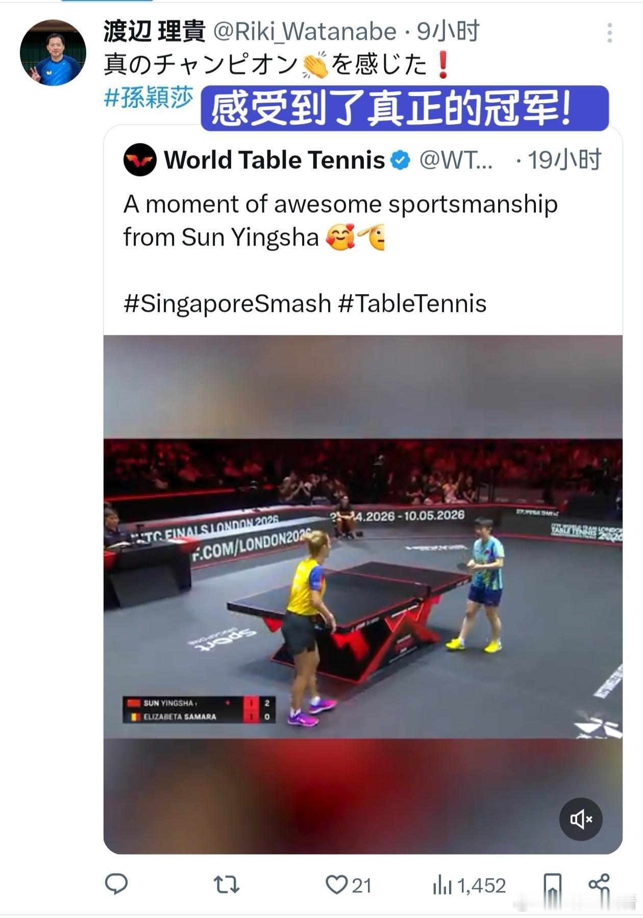 原日本国家队教练,现松岛美空教练渡边理贵转发并评论国际乒联那条莎莎提醒萨马拉TTR的推文。“感受到了真正的冠军❗️”用了一个大大的红色感叹号❗️孙颖莎孙颖莎vs萨马拉wtt新加坡大满贯wtt官方报道孙颖莎助人为乐孙颖莎不是我的分我坚决不要