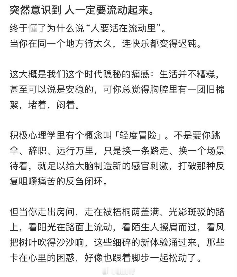“人一定要流动起来。”不是远行万里,是换条路走、换个场景待着。就像积极心理学说的“轻度冒险”——