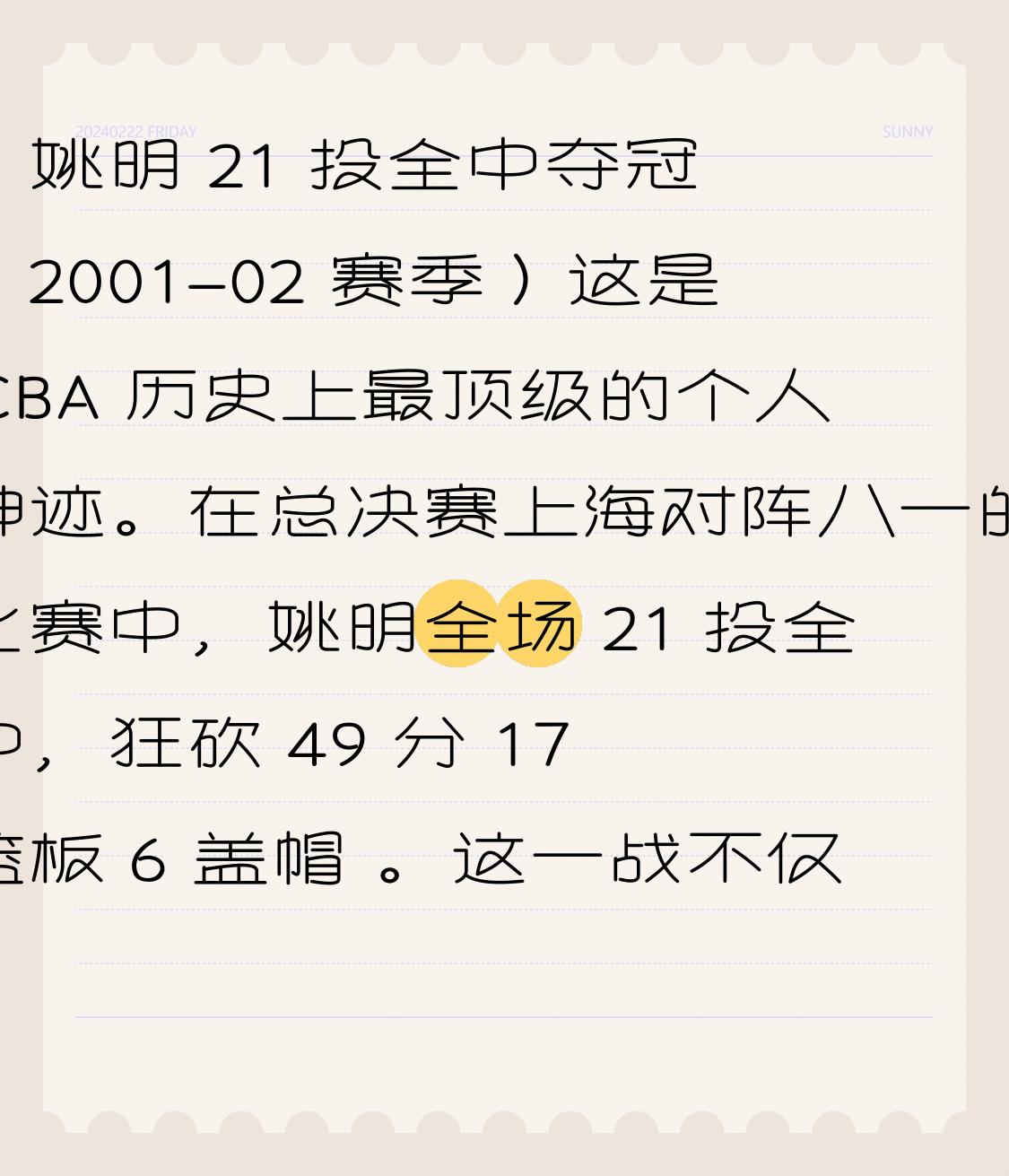 1. 姚明 21 投全中夺冠(2001-02 赛季) 这是 CBA 历...