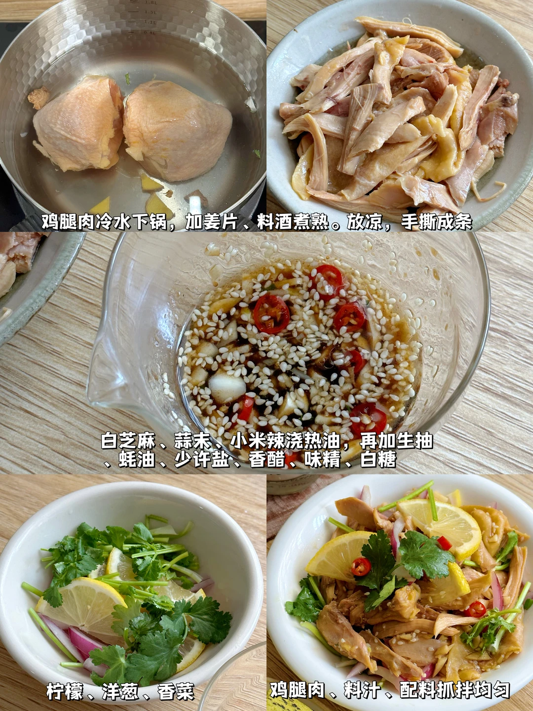 1. 鸡腿肉冷水下锅,加姜片+料酒煮熟,捞出放凉,用手撕成细条。