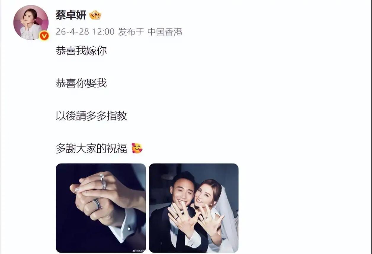 “恭喜我嫁你,恭喜你娶我。”——蔡卓妍微博官宣文案