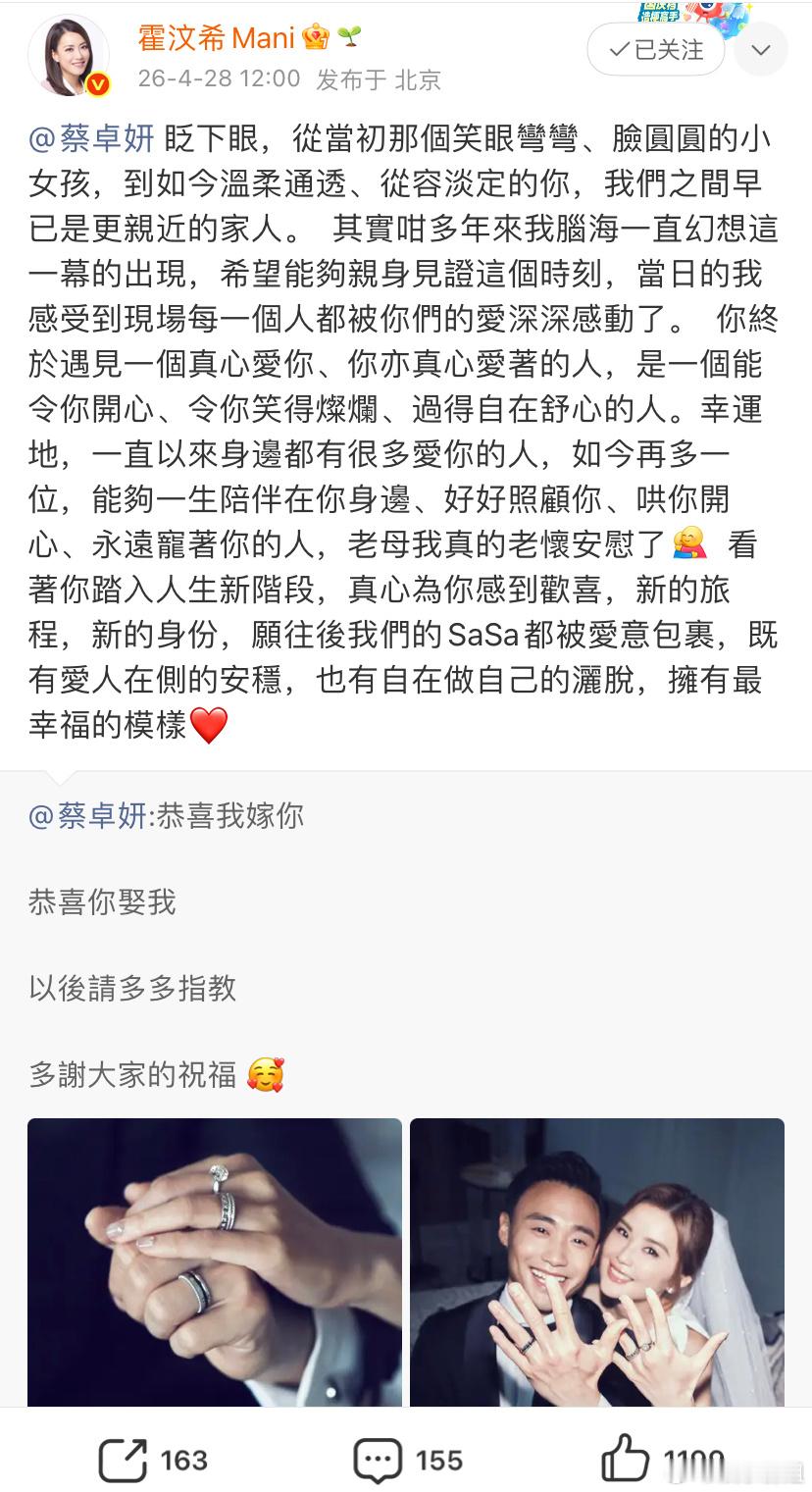 霍汶希祝福蔡卓妍霍汶希回应蔡卓妍结婚👰🏻♀️老母真的老懷安慰了 真心為你感到歡喜,新的旅程,新的身份,願往後我們的SaSa都被愛意包裹,既有愛人在側的安穩,也有自在做自己的灑脫,擁有最幸福的模樣❤️春日心动放映季