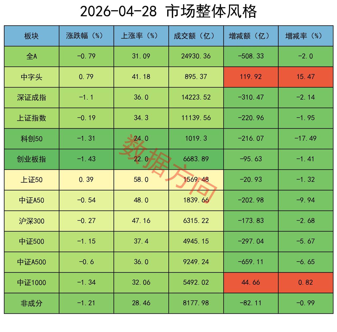 大盘整体呈现调整态势,全A指数跌幅0.79%,煤炭、油气等防御性板块上涨,多数板块飘绿,半导体产业链迎来调整,全部个股的上涨率为31%,较昨天小幅缩量2%。