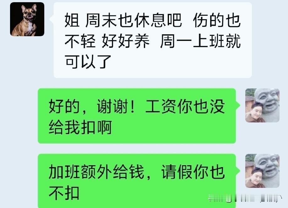 因为前几天我摔倒受伤,宝妈让我周末连休两天,好好养伤,又提前了3天把工资发给我。