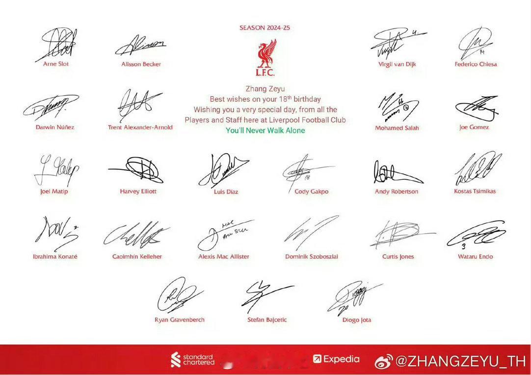 张泽禹连续两年收到利物浦的生日祝福 18岁利物浦送祝福,19岁利物浦继续送。张泽