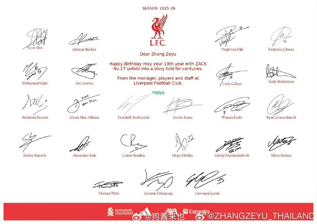 张泽禹连续两年收到利物浦的生日祝福 18岁利物浦送祝福,19岁利物浦继续送。张泽禹泰站的应援不是一次性感动,是每年准时到达的爱意