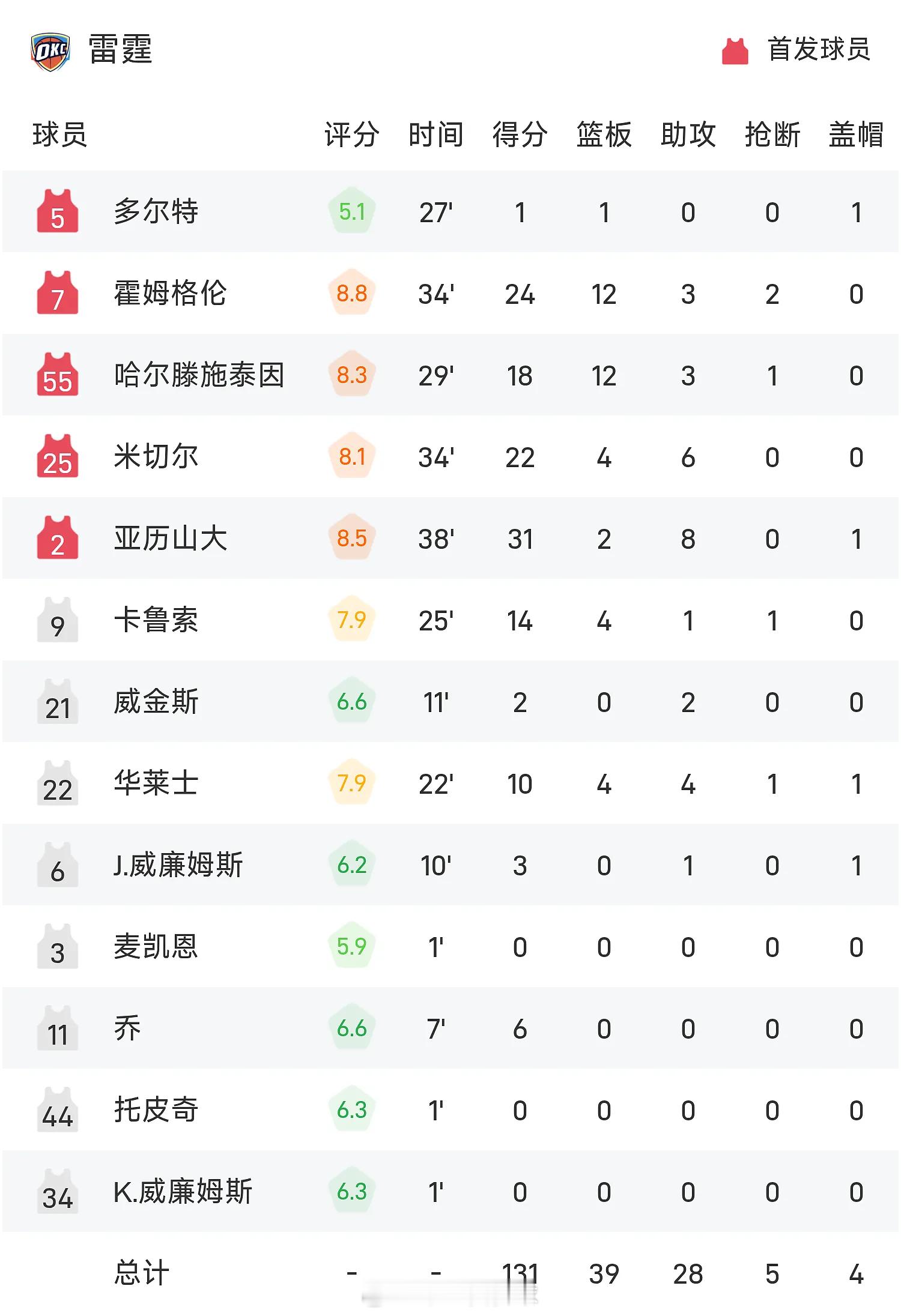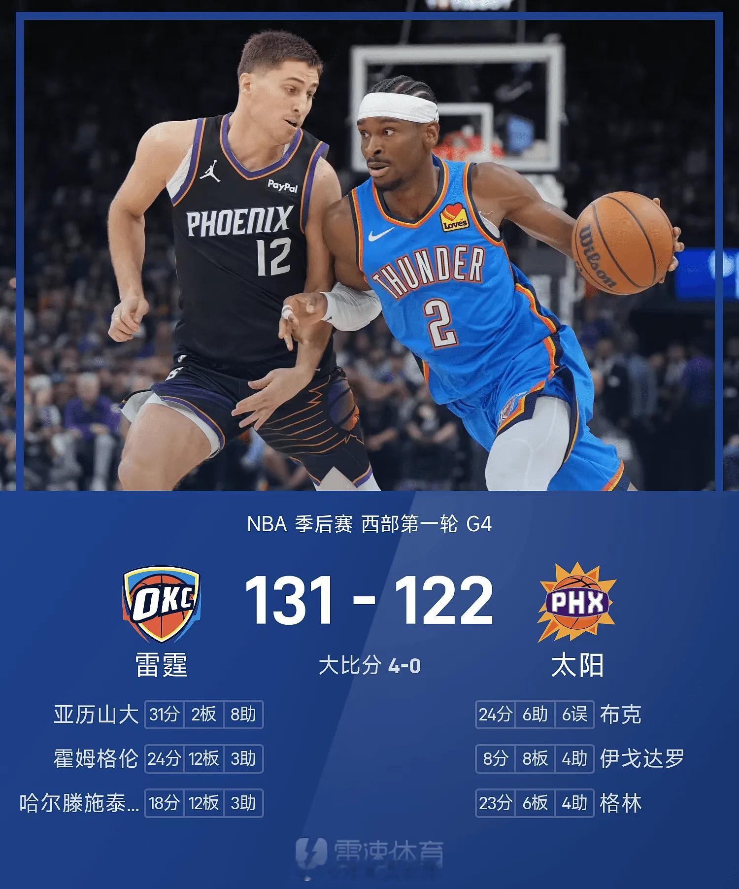04月28日讯 25/26赛季NBA 季后赛 西部第一轮,太阳对阵雷霆。双方全场战罢,太阳120-131不敌雷霆。亚历山大砍下全场最高的31分2板8助,率领雷霆成功取胜。雷霆大比分4-0晋级次轮。NBAnba比赛集锦NBA雷霆体育明星