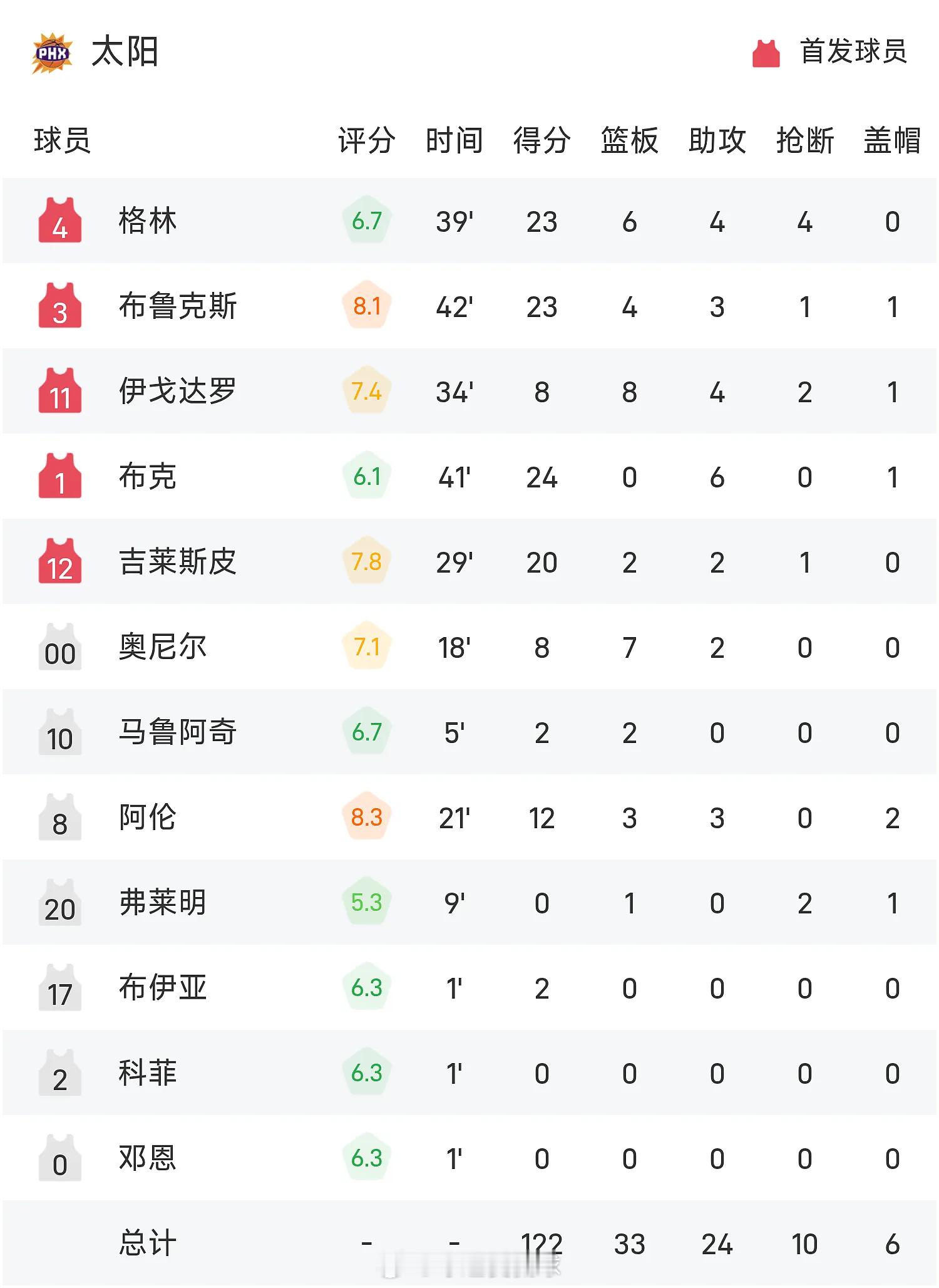 末节比赛,哈滕上来打成2+1,格林连续突破拿分,米切尔三分命中,太阳手感下滑,米切尔突破打进,取得116-104领先;布克造杀伤两罚全中止血,华莱士三分命中,亚历山大和切特相继拿分,狄龙不断拿分咬住,但雷霆逐渐稳住比赛节奏,最终成功晋级