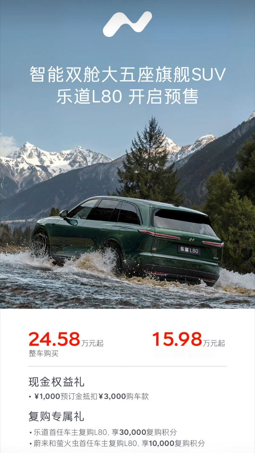 乐道L80开启预售了,预售价:电池买断式24.58万,租电是15.98万。预售1000抵3000元,乐道首任车主复购给30000积分,蔚来和萤火虫给10000积分。