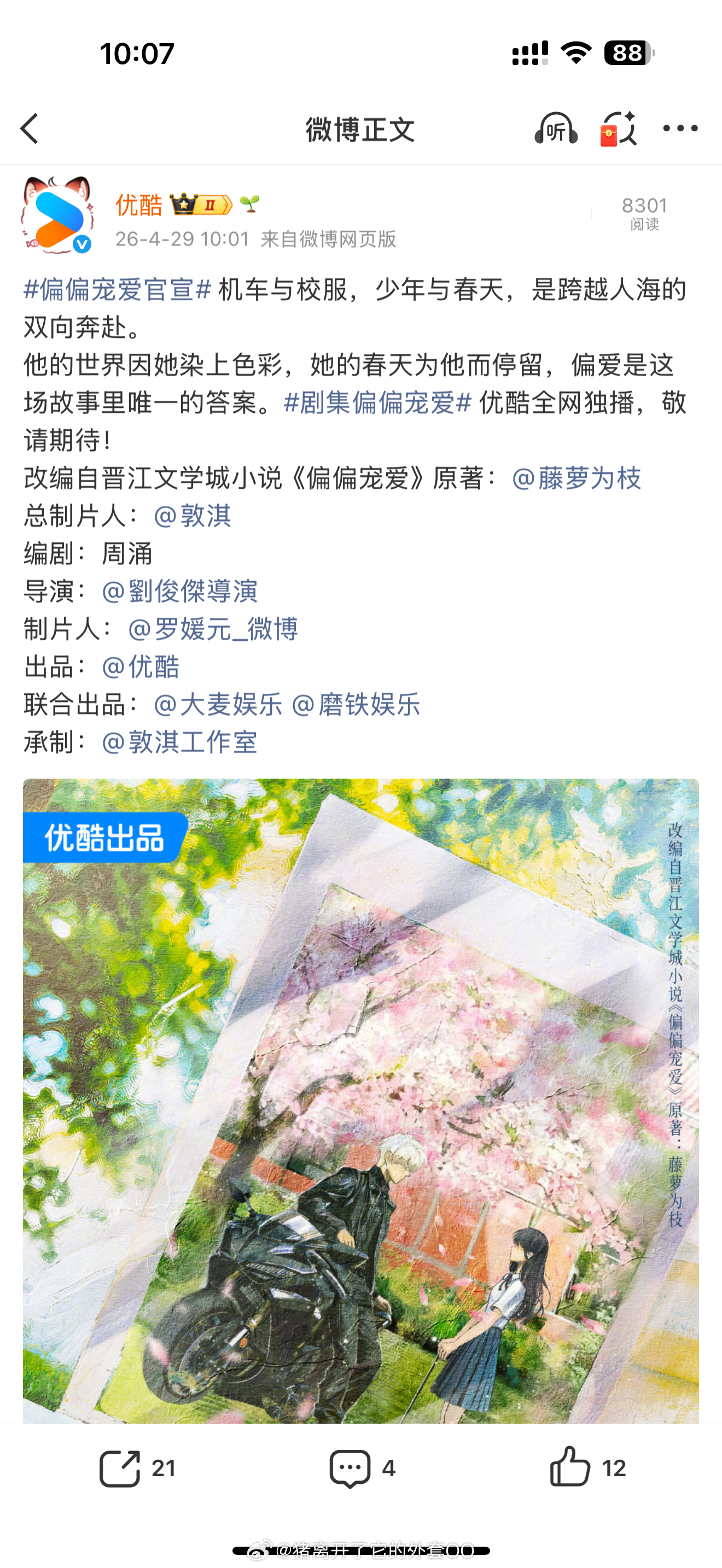 现偶《偏偏宠爱》官宣影视化发布概念海报!改编自藤萝为枝同名小说,导演刘俊杰!