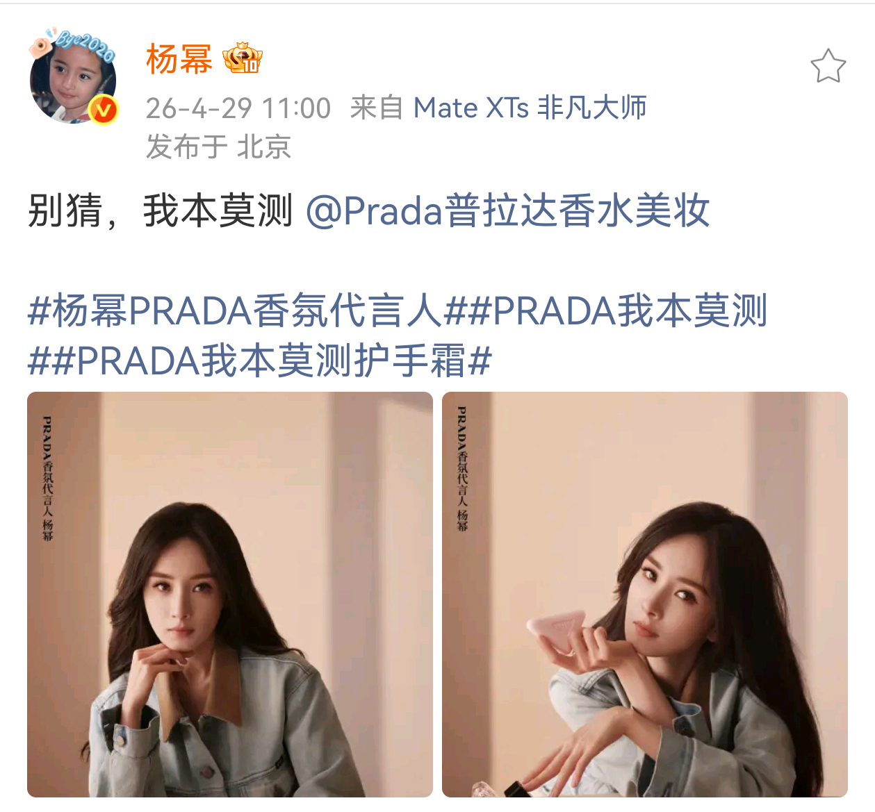 杨幂PRADA香氛代言人官宣!论幂姐的商务可以细分到什么程度奢牌超爱 杨幂PRADA香氛代言人