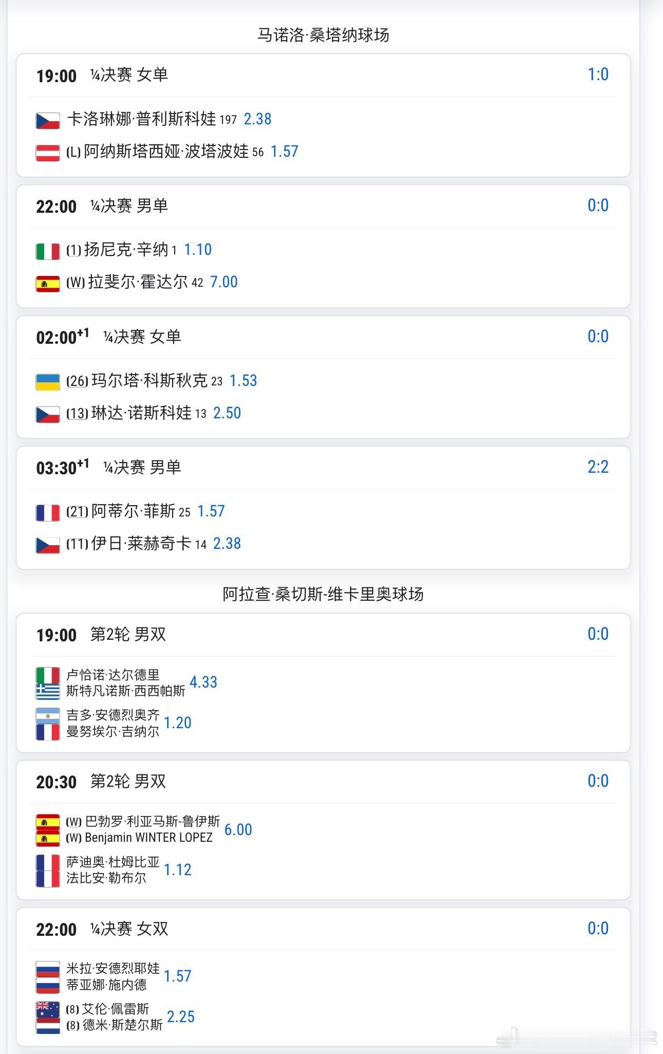 19点卡普🇨🇿vs波塔波娃🇦🇹22点辛纳🇮🇹vs霍达尔🇪🇸明天凌晨2点诺斯科娃🇨🇿vs科斯秋克🇺🇦随后菲斯🇫🇷vs莱赫切卡🇨🇿