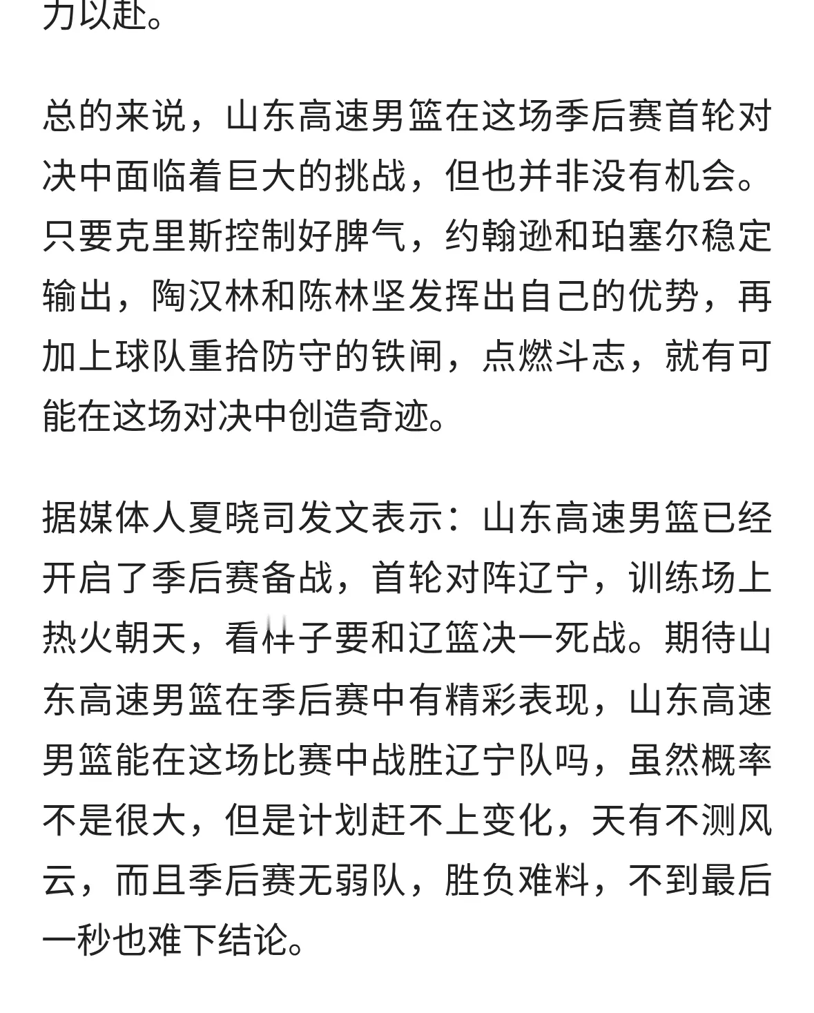 CBA最新消息:据知名篮球自媒体人所罗门的臣仆发文写道:“山东男篮季后赛保留萨夏