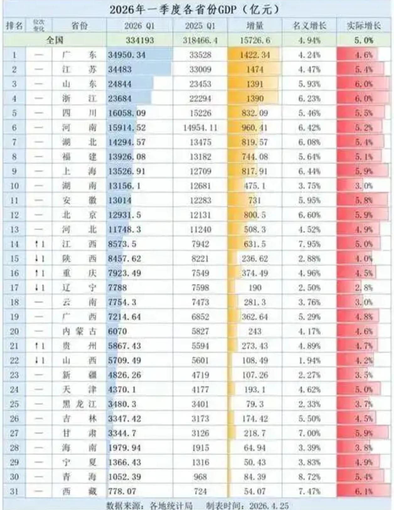 31省一季报:粤苏差距缩至467亿,江西重庆贵州集体“上位”