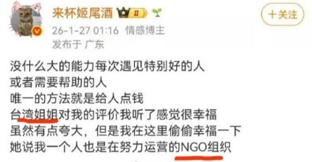首先,她在今年一月份的发帖中透露,自己和一位台湾姐姐关系很好,甚至二人还有过一段时间的特殊恋情关系。同时也透露了,那位台湾姐姐是台湾一个NGO的运营者,她还在社交媒体上炫耀了那位台湾姐姐的护照。