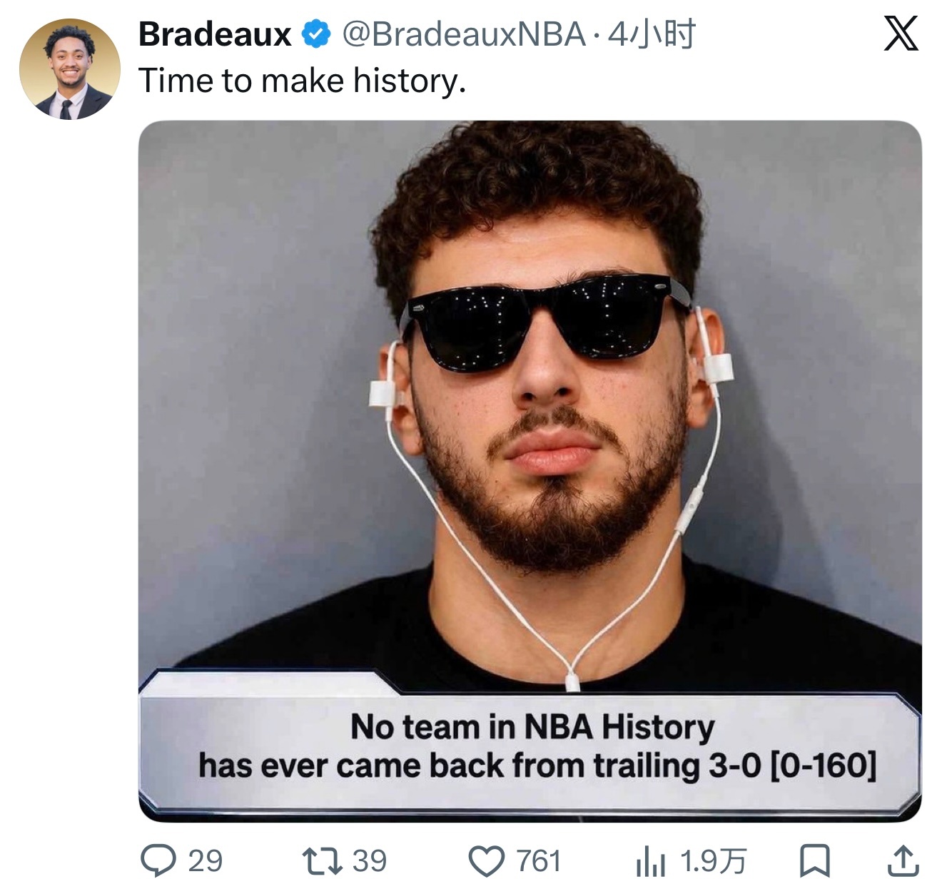 火箭记者Bradeaux晒图配文:“是时候创造历史了。”