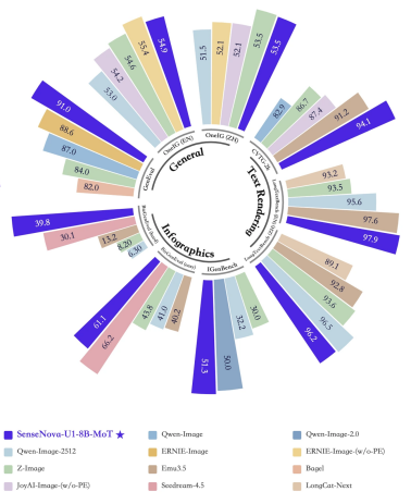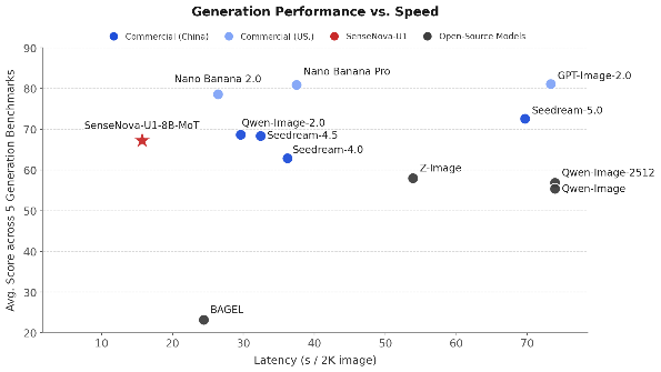 视觉推理基准测试结果以下两组对比图更直观地展现了SenseNovaU1Lite在效率上的突出优势。在通用的图像生成测试中,SenseNovaU1Lite不但在图像生成质量上比肩Qwen-Image2.0Pro或Seedream4.5等大型闭源模型,达到商业级水准,还在推理响应速度上有显著优势。即使在极具挑战性、开源模型一直做不好的复杂信息图生成任务中,SenseNovaU1Lite也表现出商业级的水准,对复杂信息图的排版和文字有很强的控制力。