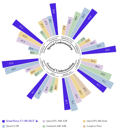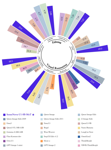 本次开源发布的是SenseNovaU1的轻量版系列SenseNovaU1Lite。它包含两个不同规格的模型:SenseNova-U1-8B-MoT:基于稠密骨干网络;SenseNova-U1-A3B-MoT:基于混合专家(MoE)骨干网络