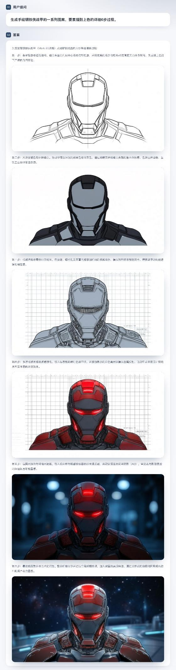 任务二:绘制一个钢铁侠图案:它可以从扫描草稿出发,逐步进行连续创作,最终做出一个完成度很高的图像。每一步创作的过程对于前一步的结构和细节都做了精准的保持——一个统一表征的共享上下文在其中发挥了关键作用。