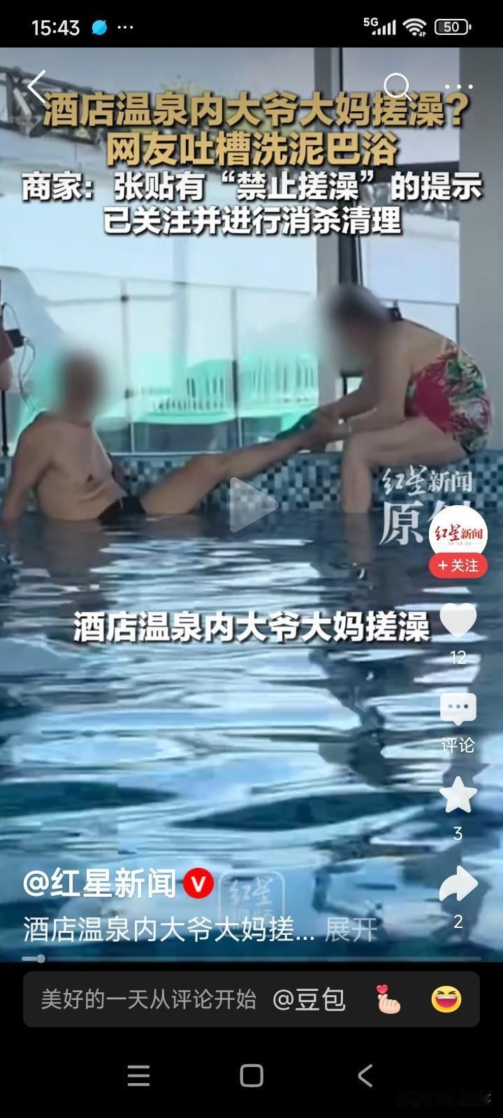 酒店工作人员回应称,游泳池旁贴有禁止在池内搓澡的标识,工作人员每半小时会巡视一次,一旦发现不文明行为就会制止。