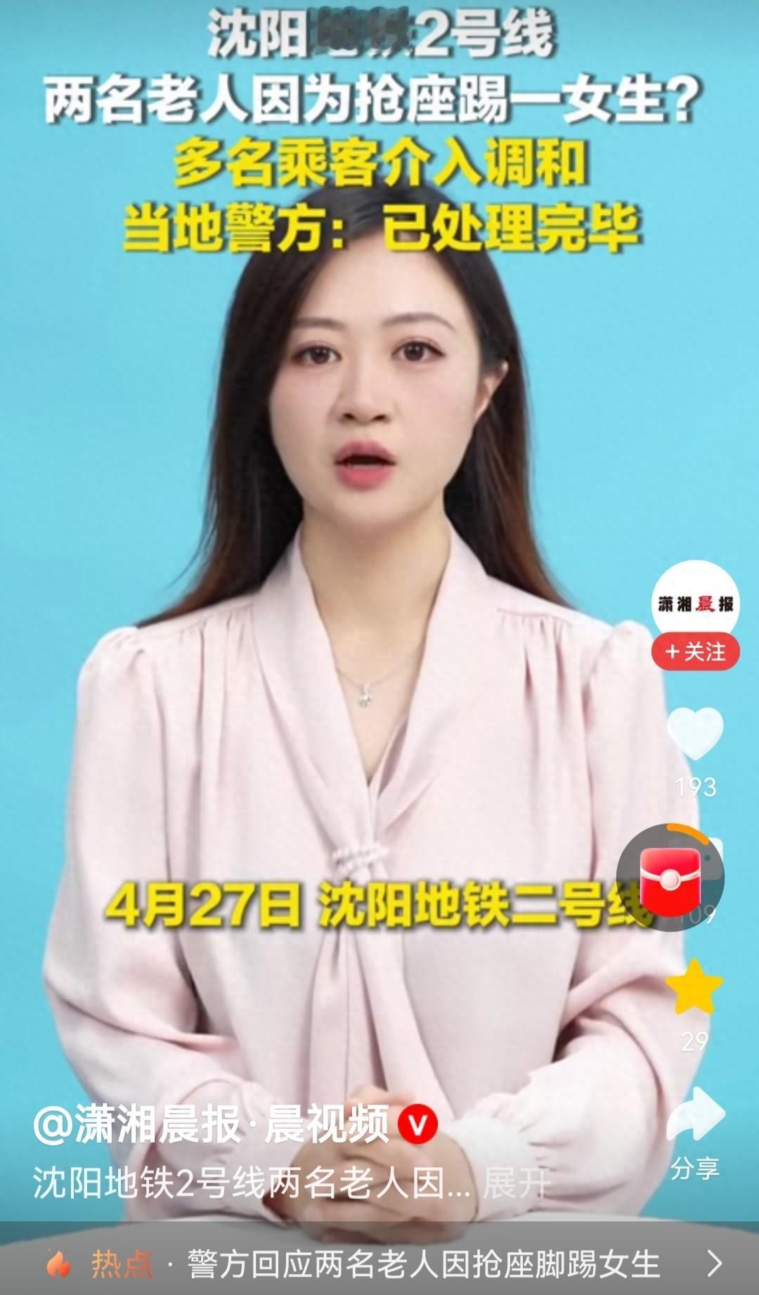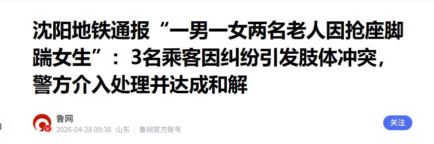 信源:鲁网 —— 沈阳地铁通报“一男一女两名老人因抢座脚踹女生”:3名乘客因纠纷引发肢体冲突,警方介入处理并达成和解