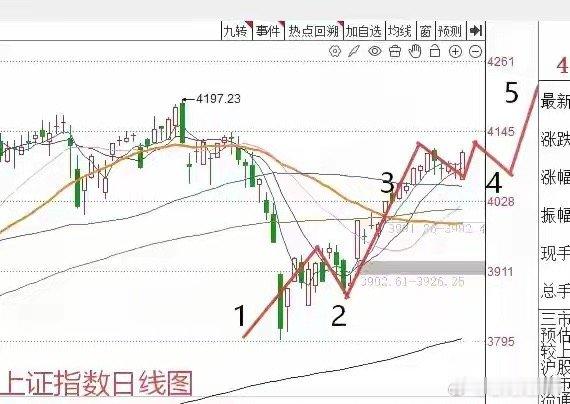 第二,今天沪指这一根大阳线上穿了5日10日均线,不仅止住了短期的跌势,而且在技术面形成了类似“起涨”性质的大阳线。从今天上证指数的走势来看,市场指数是有望开启第5浪的上升。第5浪会走出什么样子?大家请看下图——上证指数五浪结构预判图。当然这里。的判断来自于,接下来市场将会走出强势的连续拉升行。因为今天如果是强势5浪的起点的话,那么接下来市场就不应该出现减速的走势。