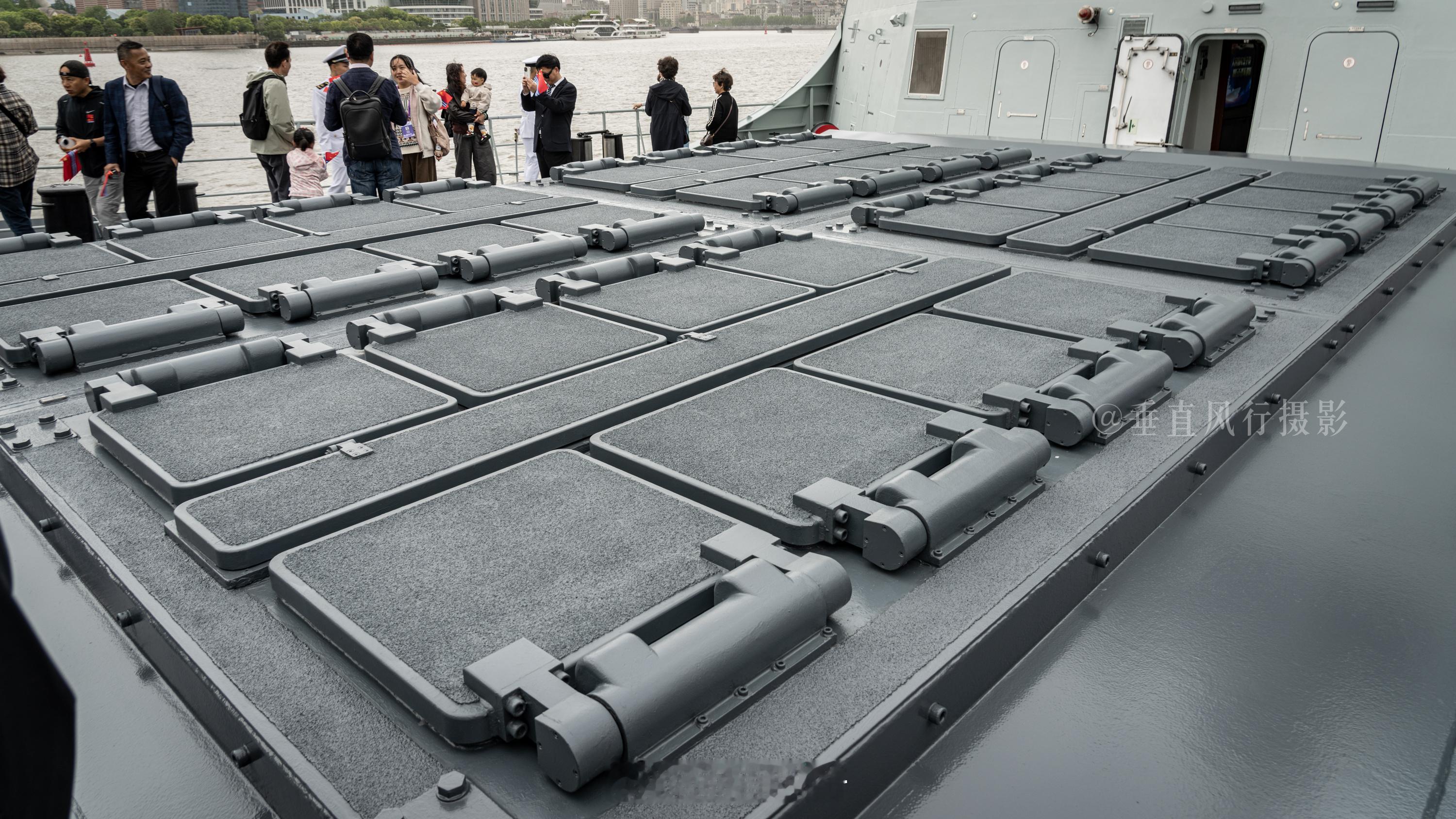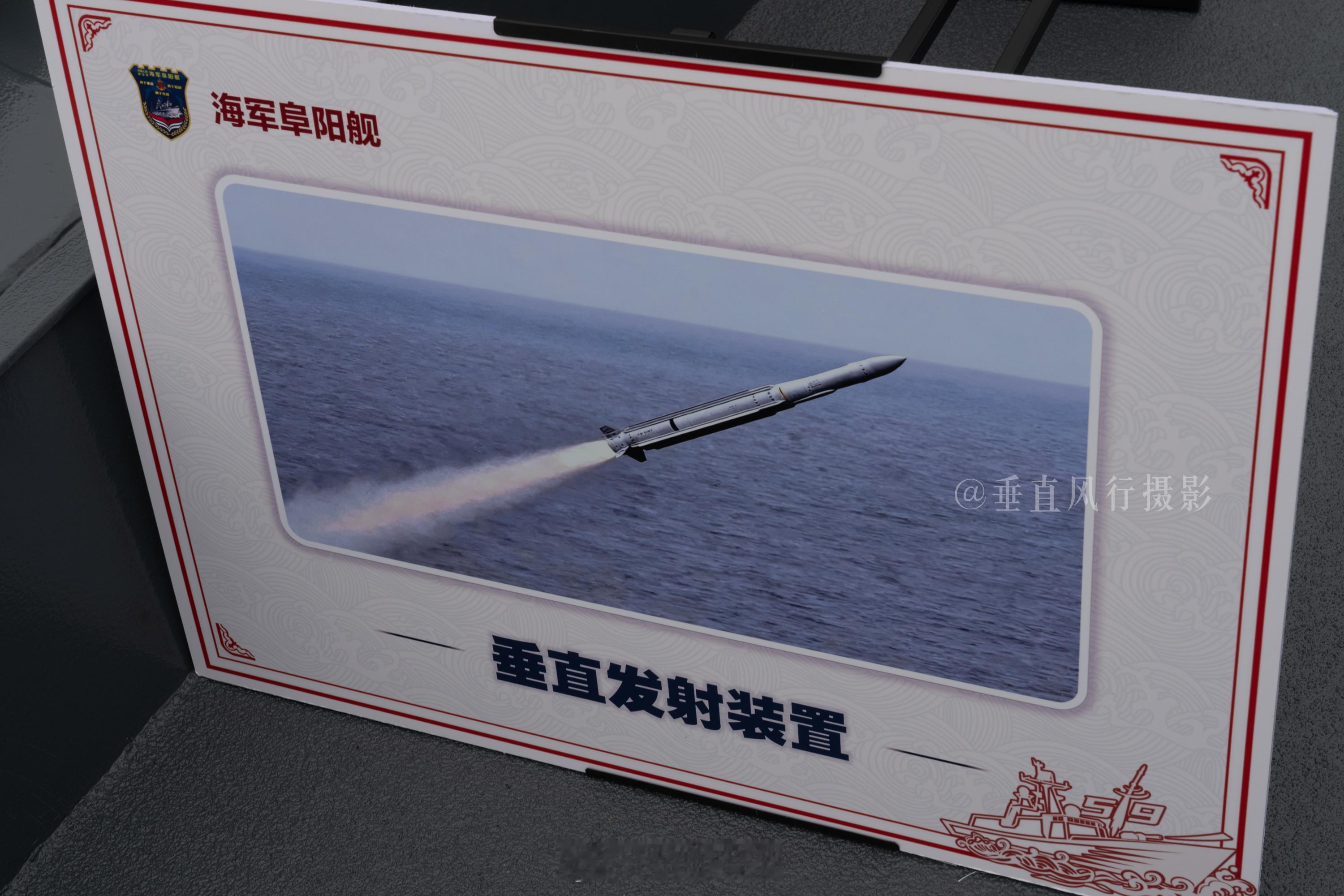 阜阳舰在上海开放期间,部分区域设置了展板介绍,前甲板垂直发射装置的展板就很有意思了,你说它潦草吧,它确实把人家老美的RIM-162张冠李戴印上去了,可RIM-162给Mk41是一坑四弹来用的。你跟我好好说阜阳舰,你是不是就是这个意思?海军节海军中国海军节