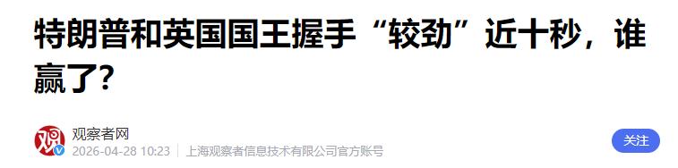 欢迎仪式上,特朗普与查尔斯三世的握手直接引爆热搜。特朗普向来靠力道大、时间长的握手彰显主导地位,这次却遇上了硬茬——查尔斯三世同样力道十足,两人紧紧攥手较劲近十秒,谁都不肯示弱。这根本不是普通外交握手,就是两个权力人物的气场对决,一个想立威,一个要守尊严,互不妥协。