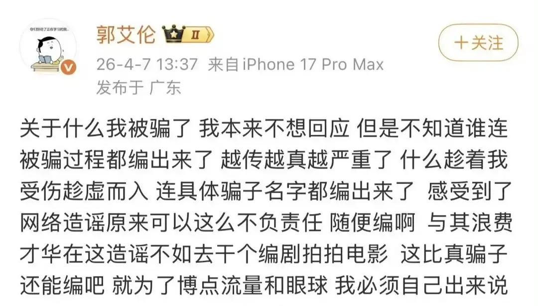 4月7日晚,正在养伤的郭艾伦开播亲自澄清传闻:所谓“被骗一千万、在姐姐陪同到沈阳报案”全是子虚乌有的编造。
