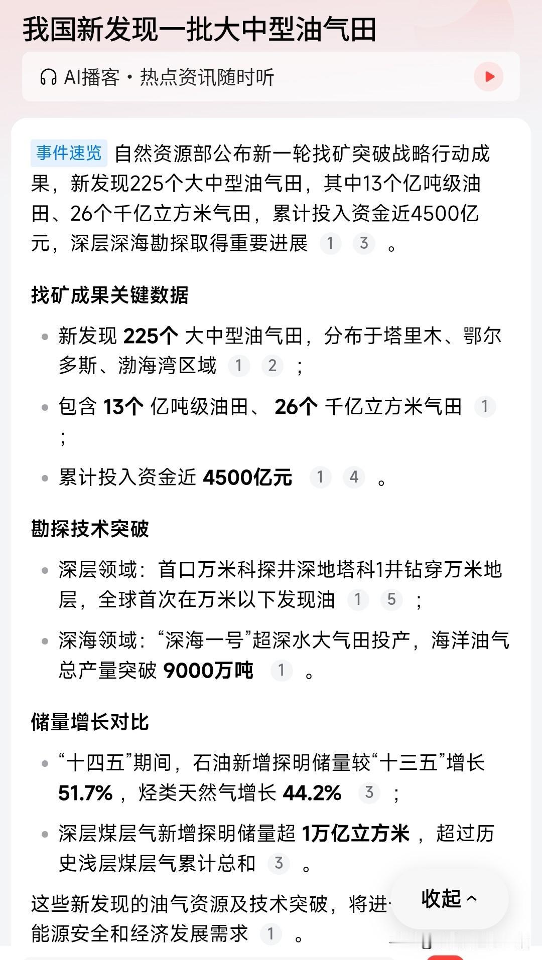 国家一口气宣布发现225个大型油气田,就是对外界表明,别以为只有你们有油气资源在手,俺们家也是有实力的。只不过之前一直保持低调而已,现在稍微显示一下,让你们也开开眼。