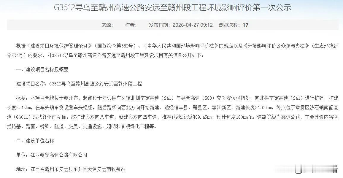近日,G3512寻乌至赣州高速公路安远至赣州段工程发布环境影响评价第一次公示。