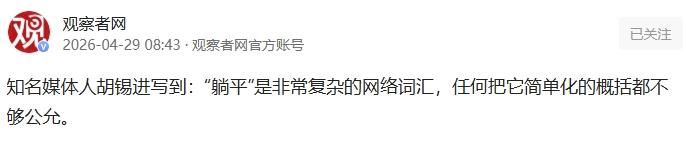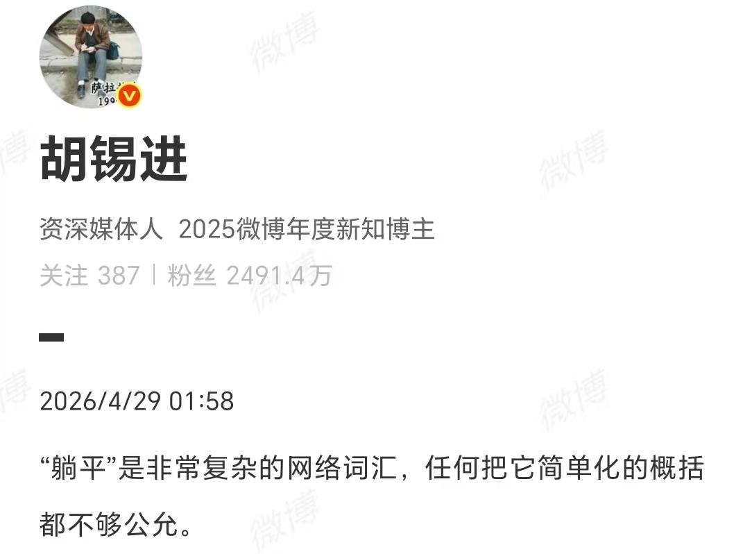 胡锡进在个人社交平台上聊起这个话题时,说得特别实在,他没站在高处说教,也没盲目附和,而是先明确表态:如果有人就是单纯想选择躺平,那就是人家的权利。
