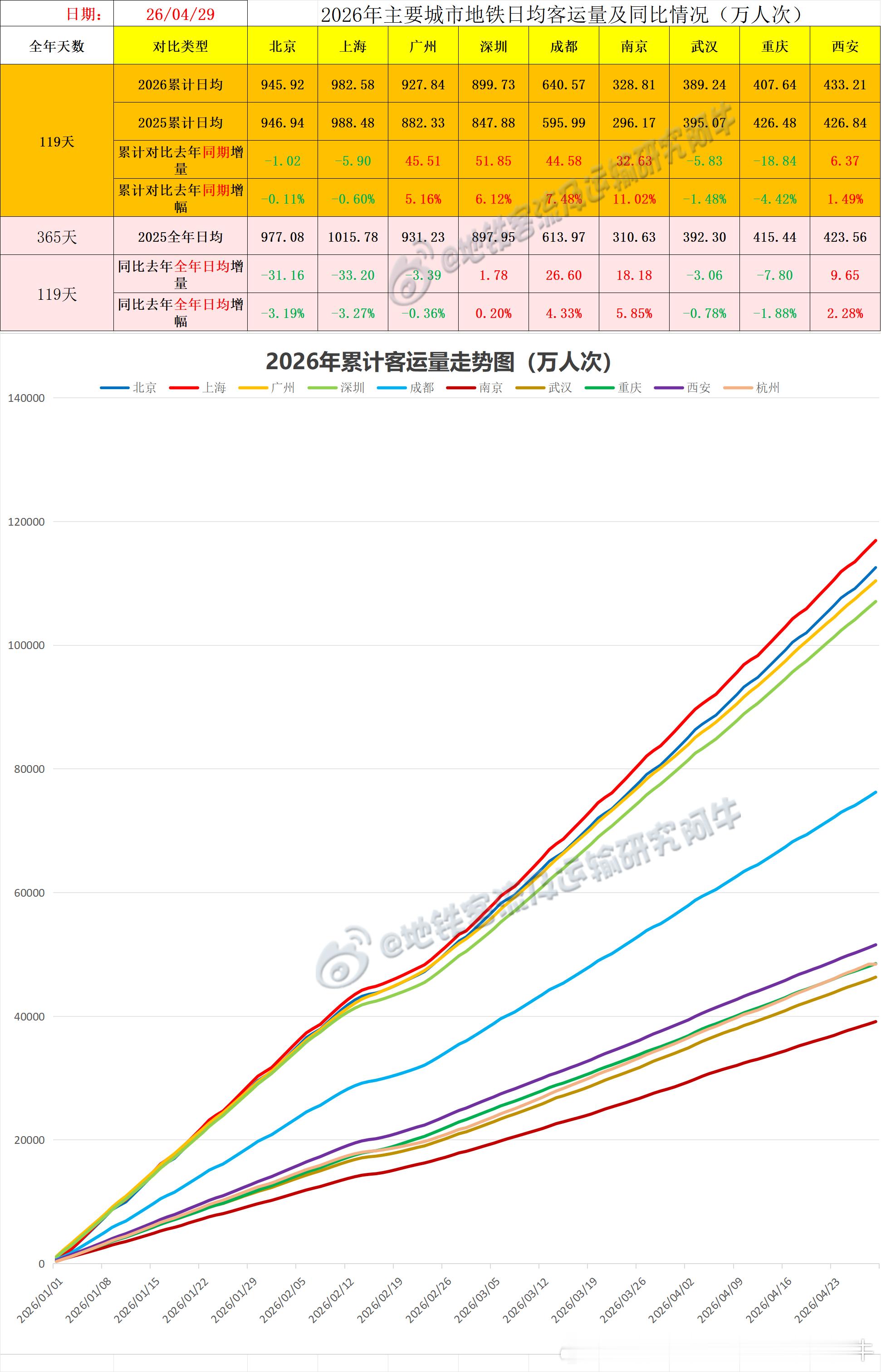 【中国城市地铁客流排行榜 2026-04-29(周三,农历三月十三,中国地铁客流日报】主榜风云:19城争霸,京深双榜!——五一大战一触即发:帝都轻取大位,魔都震惊,痛斥不讲武德! 长沙、哈尔滨客强击败诸多大哥迅速攀升至第二、三名。北京地铁上海地铁广州地铁深圳地铁成都地铁西安地铁武汉地铁重庆轨道交通南京地铁长沙地铁郑州地铁沈阳地铁天津地铁合肥地铁苏州地铁青岛地铁哈尔滨地铁南昌地铁宁波地铁地铁客流及运输研究阿牛的微博