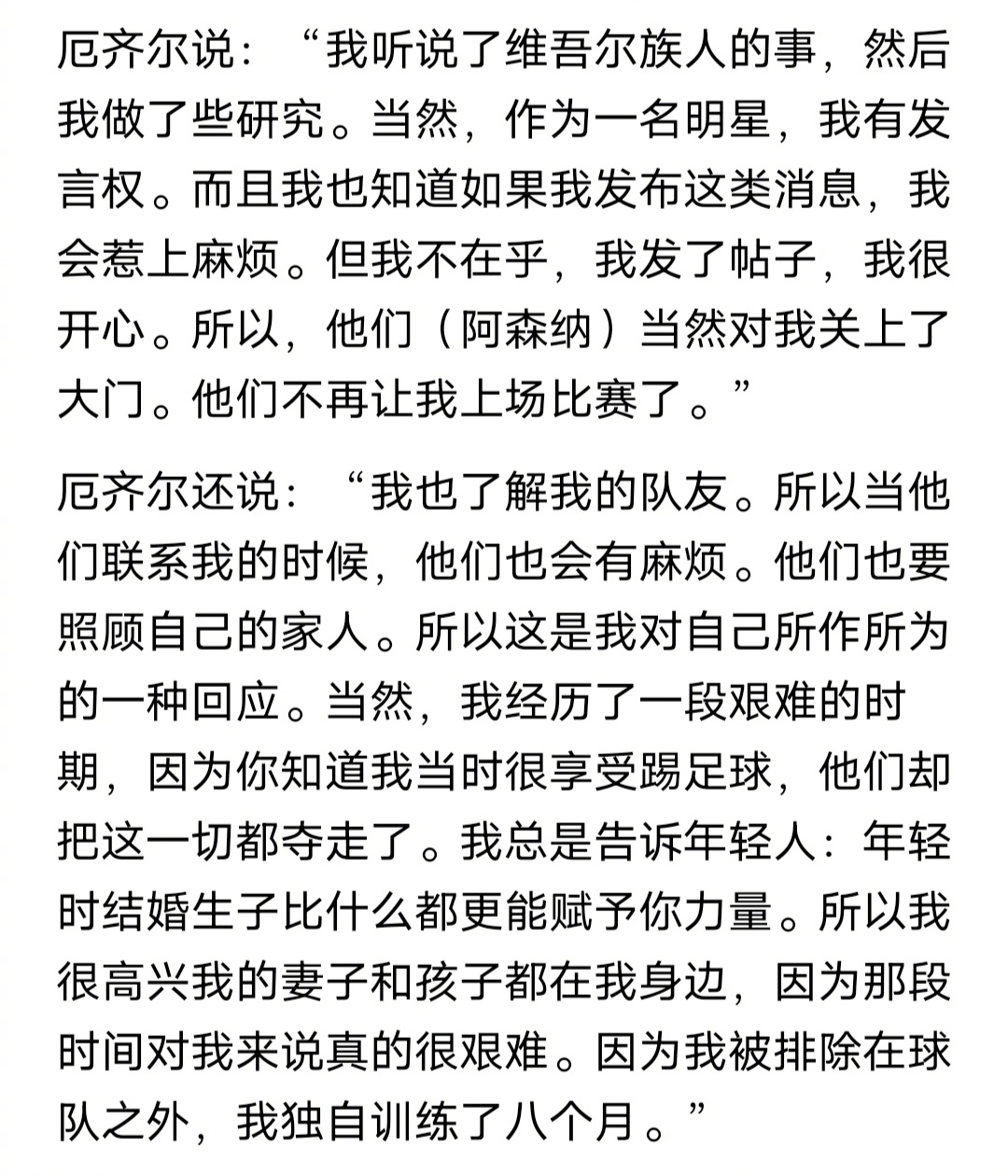 他还委屈上了,厄齐尔抱怨说:因为他发表了涉华错误言论,导致他被阿森纳弃用。