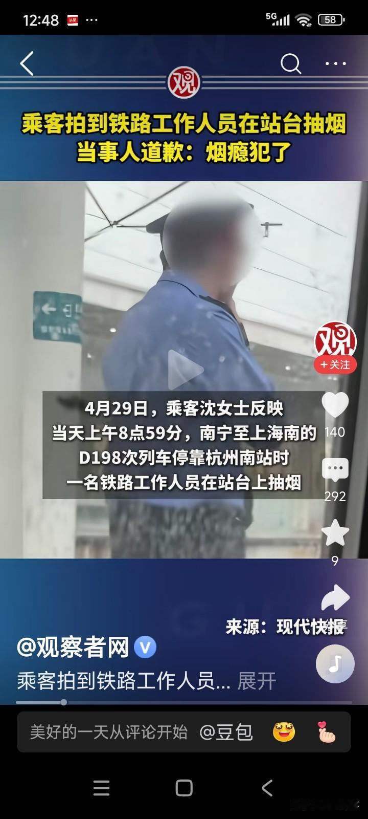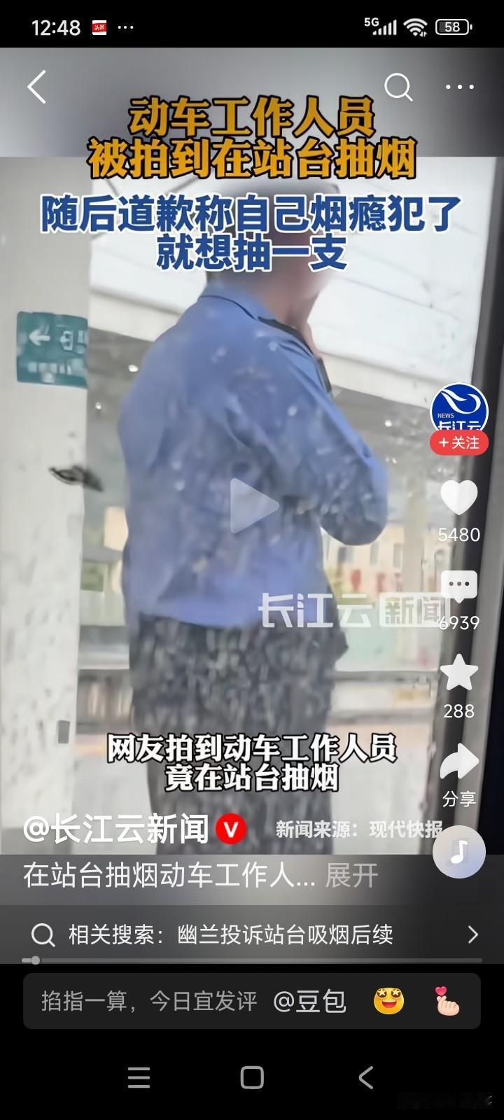 高铁站工作人员回应称,高铁站台严禁抽烟,这是管理规定,该工作人员在站台上抽烟属于违规行为,涉事男子已发布视频道歉。