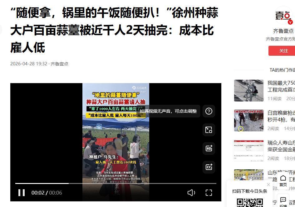 信源:潇湘晨报2026.4.28——“随便拿,锅里的午饭随便扒!”徐州种蒜大户百亩蒜薹被近千人2天抽完:成本比雇人低
