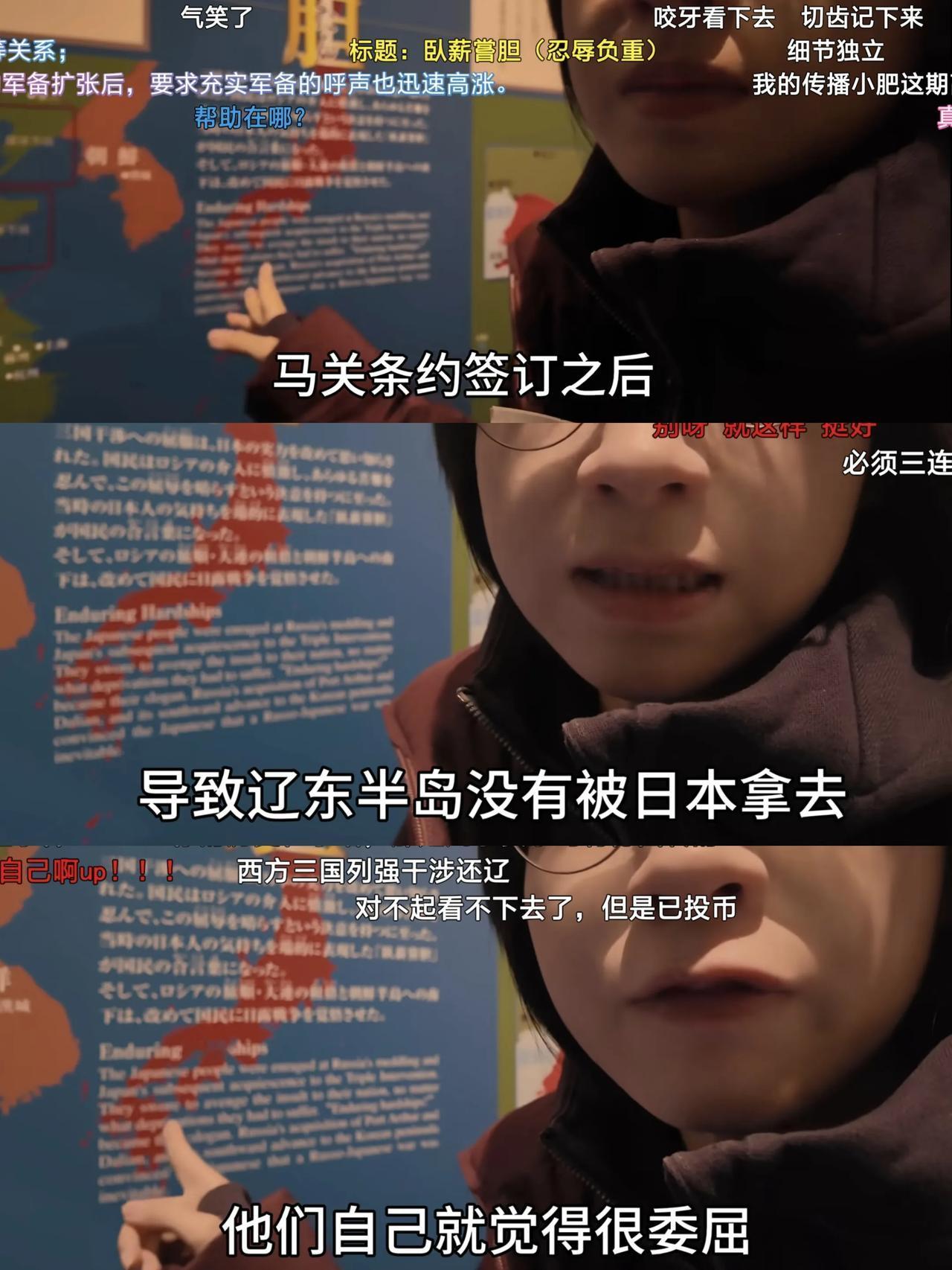 但是这位小姐姐仔细的介绍了每一处,比如说他们特别善于把自己伪装成受害者,当初的辽东半岛没有被他们拿去,他们就特别的委屈,上面还写了卧薪尝胆四个字。