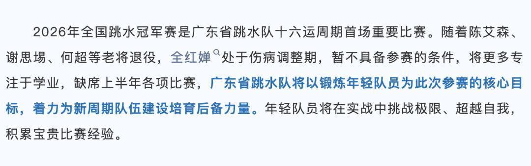 广东队将锻炼年轻队员,着力为新周期队伍建设培育后备力量,这已经很明了,跳水一天不练状态就下滑,长时不练身体状态早已无法再站上赛场。